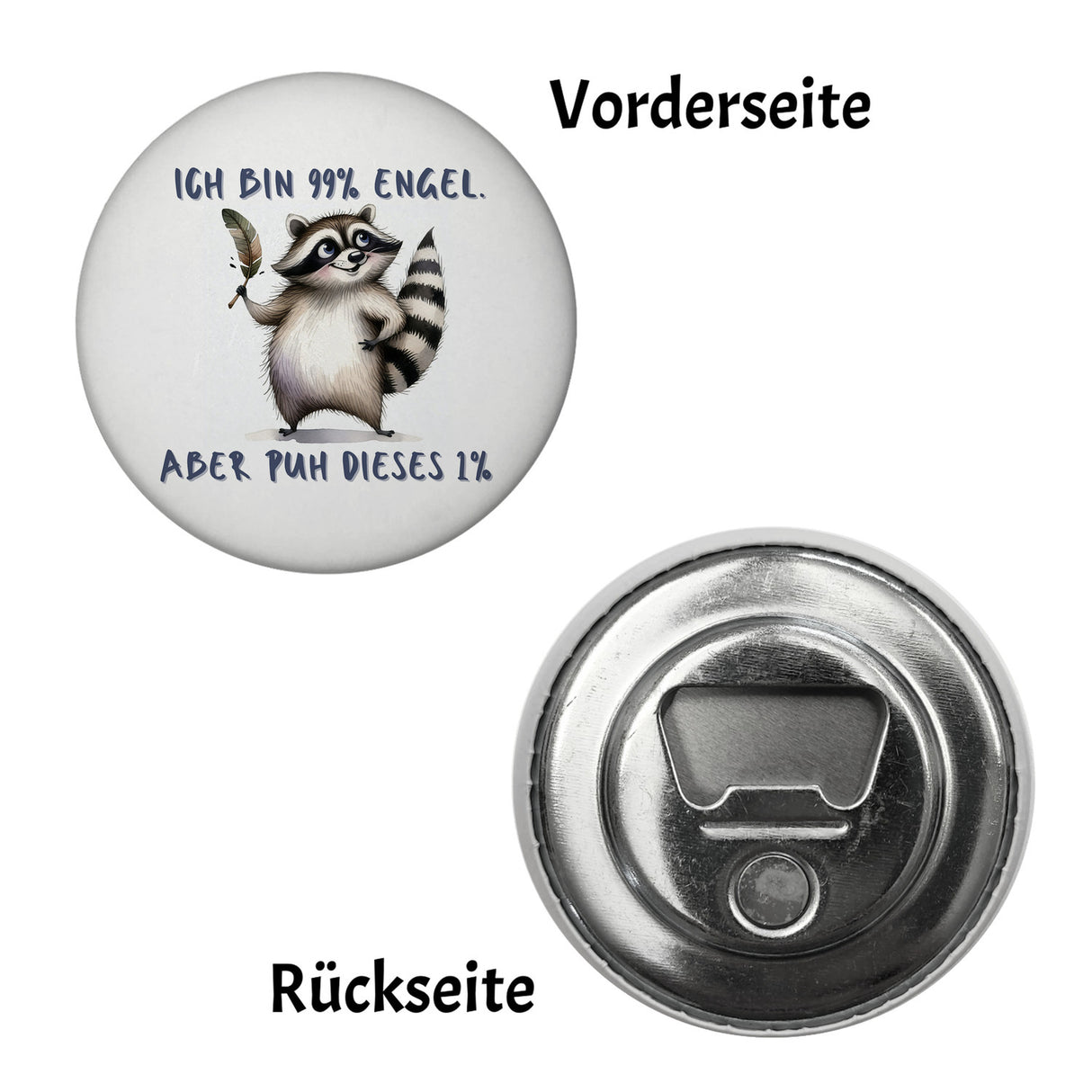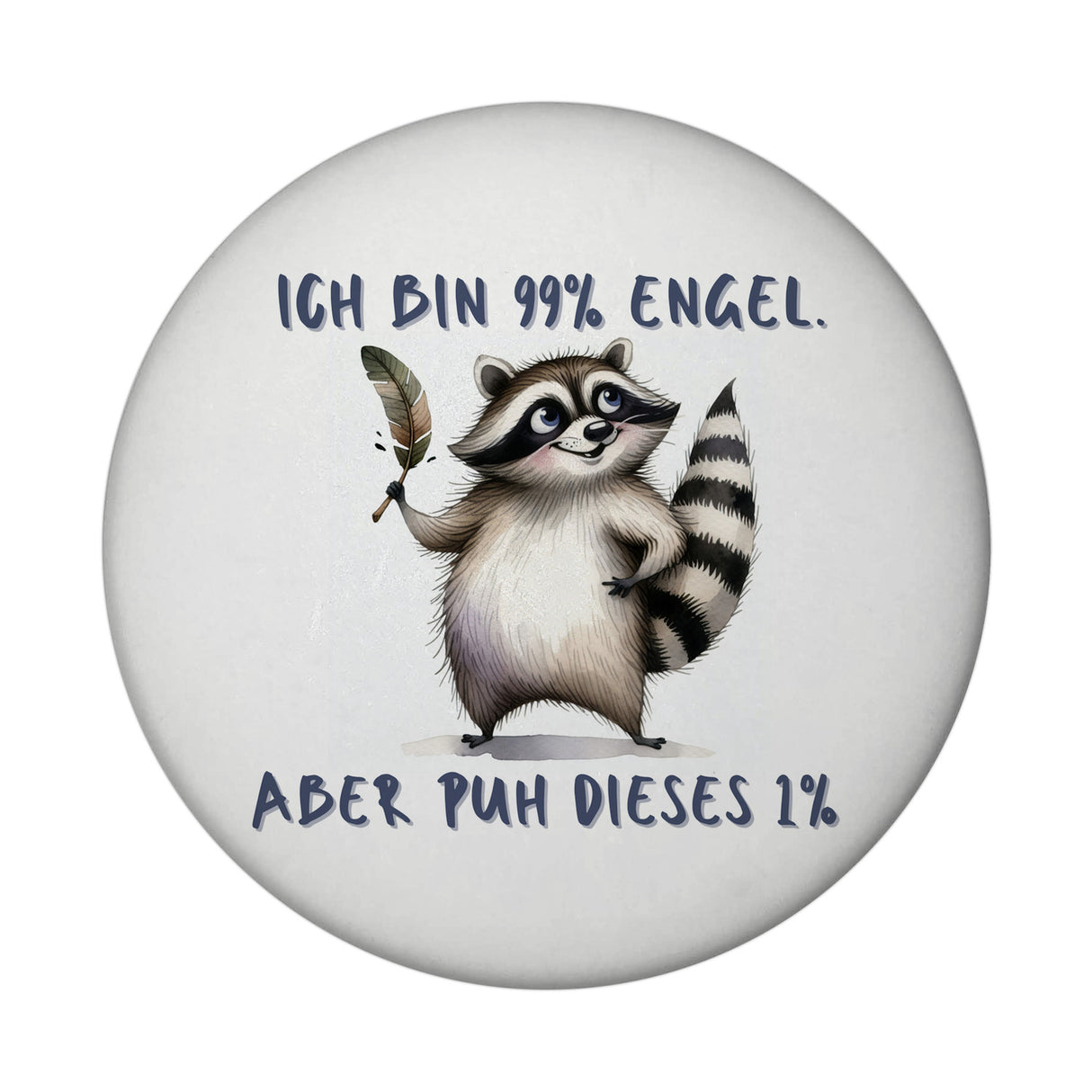 - 1x Waschbär Magnet rund mit Spruch Ich bin 99% Engel Aber puh dieses 1% in der gewählten Ausführung