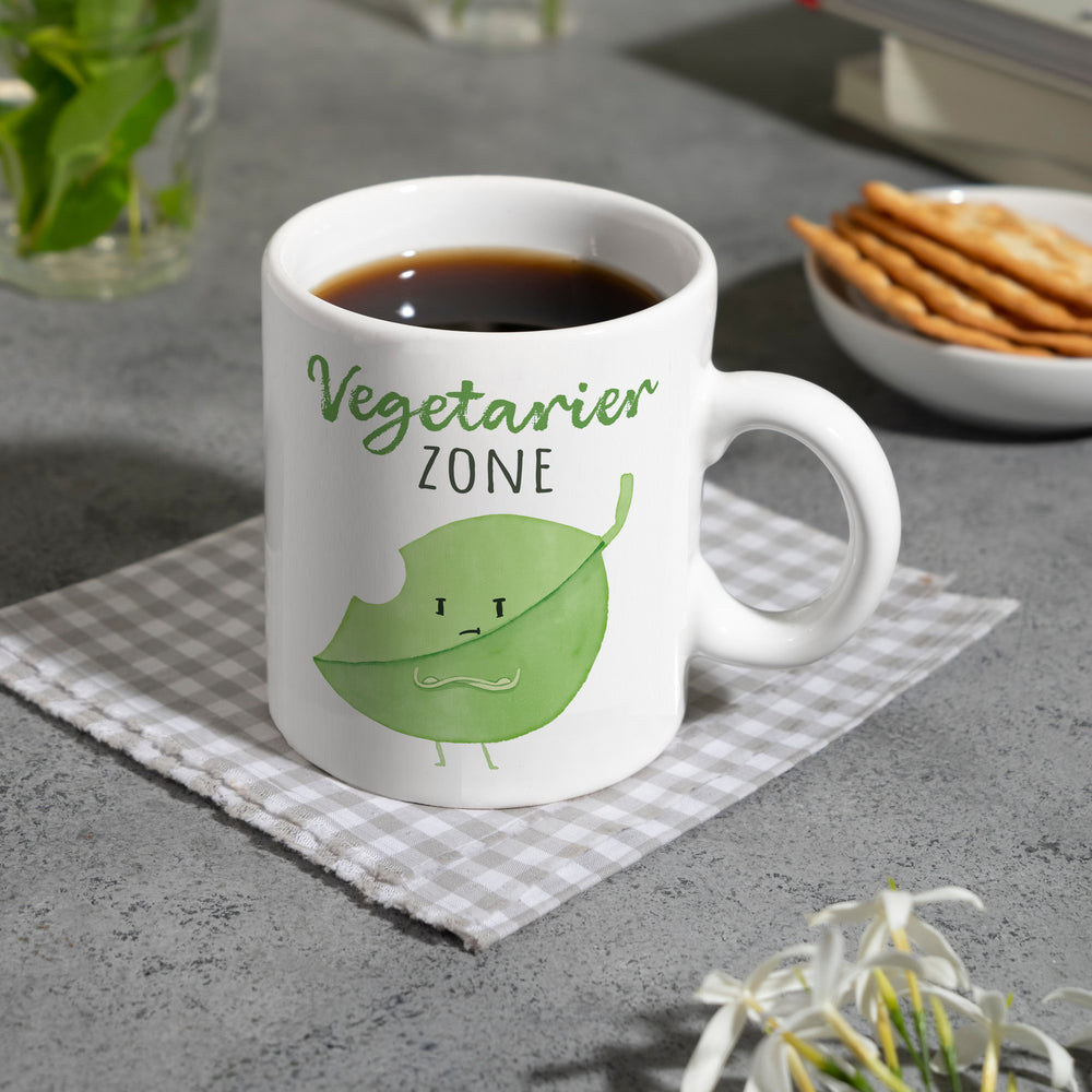 Blatt Kaffeebecher mit Spruch Vegetarier Zone - Weiß ist auf Lager und wird versandt, sobald es wieder verfügbar ist