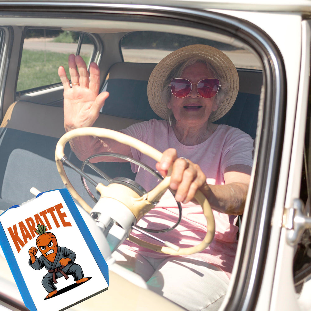 - Die "Karate Karotte" Parkscheibe ist ein echter Hingucker! Auf ihr prangt ein Cartoon-Karottenkrieger in traditioneller Kampfsport-Kleidung. Mit entschlossenen Augenbrauen und einer starken Kampfhaltung beeindruckt diese lustige Karotte auf einem cleanen weißen Hintergrund, ergänzt durch den lustigen Schriftzug "Karatte" in cooler Kampfkunst-Optik.