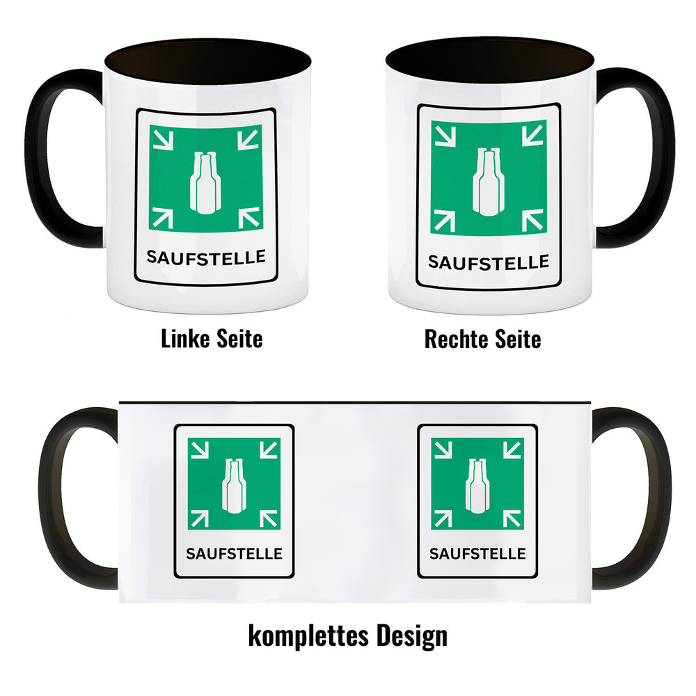 • Dieser coole Kaffeebecher mit Hinweisschild-Motiv ist eine tolle Geschenkidee für Biertrinker mit Humor. Der Becher zeigt ein paar Bierflaschen und den Spruch „Saufstelle“ - perfekt zum Wiegenfest oder Geburtstag von Freunden und Kollegen! Mit dem Becher kann man nicht nur Kaffee trinken, sondern auch alle anderen Heiß - und Kaltgetränke.
