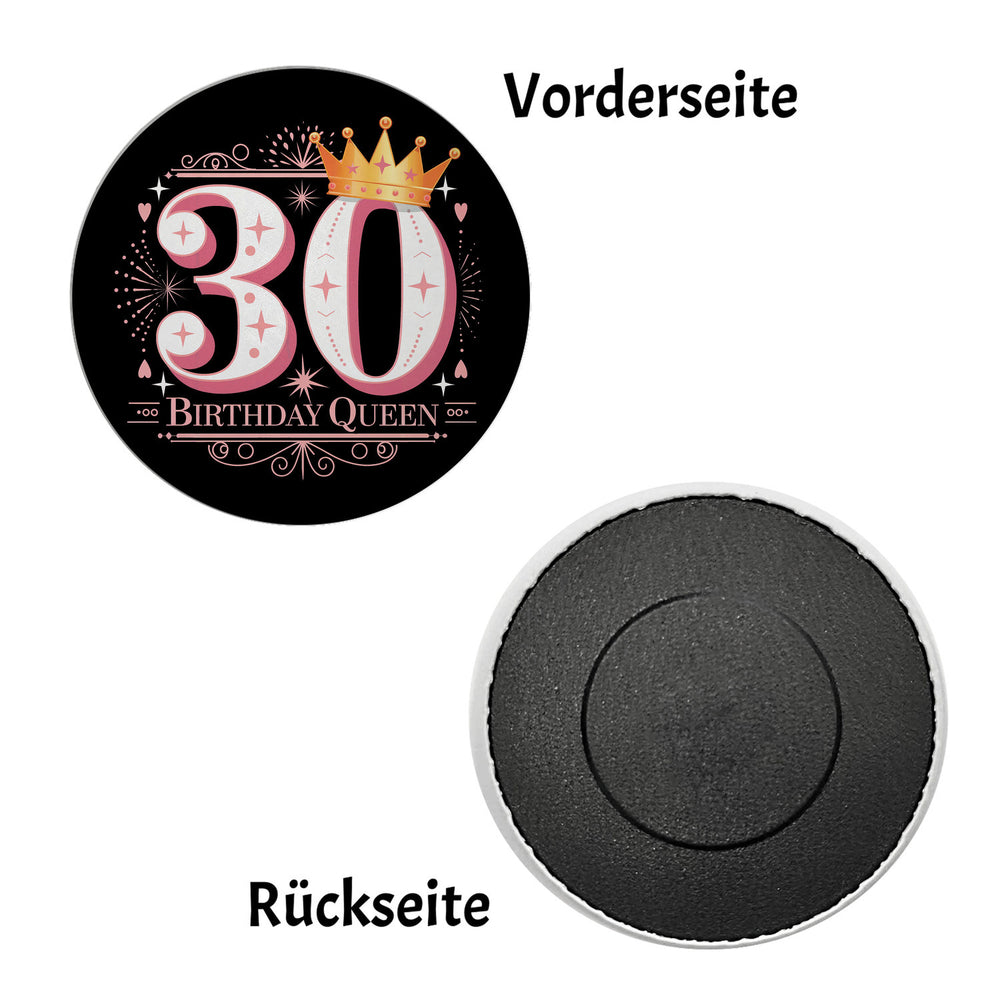 • 1x 30 mit Krone Magnet rund mit Spruch Birthday Queen in der gewählten Ausführung