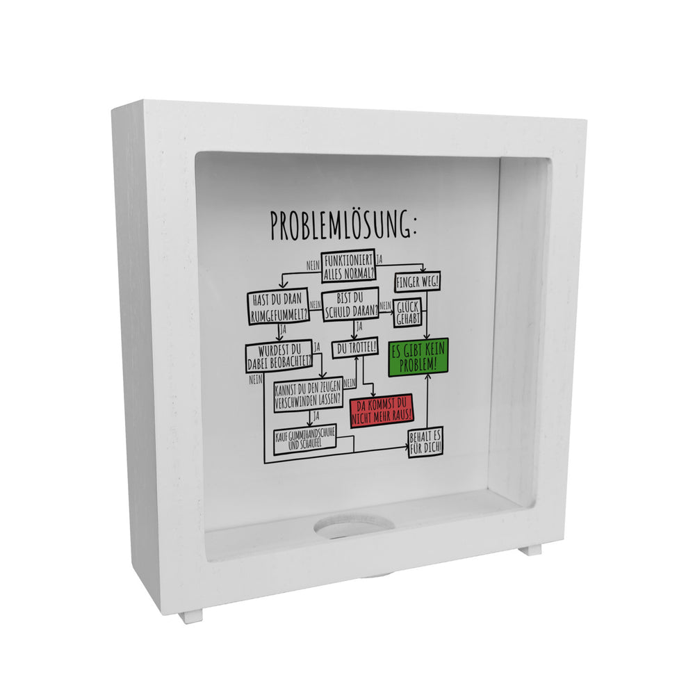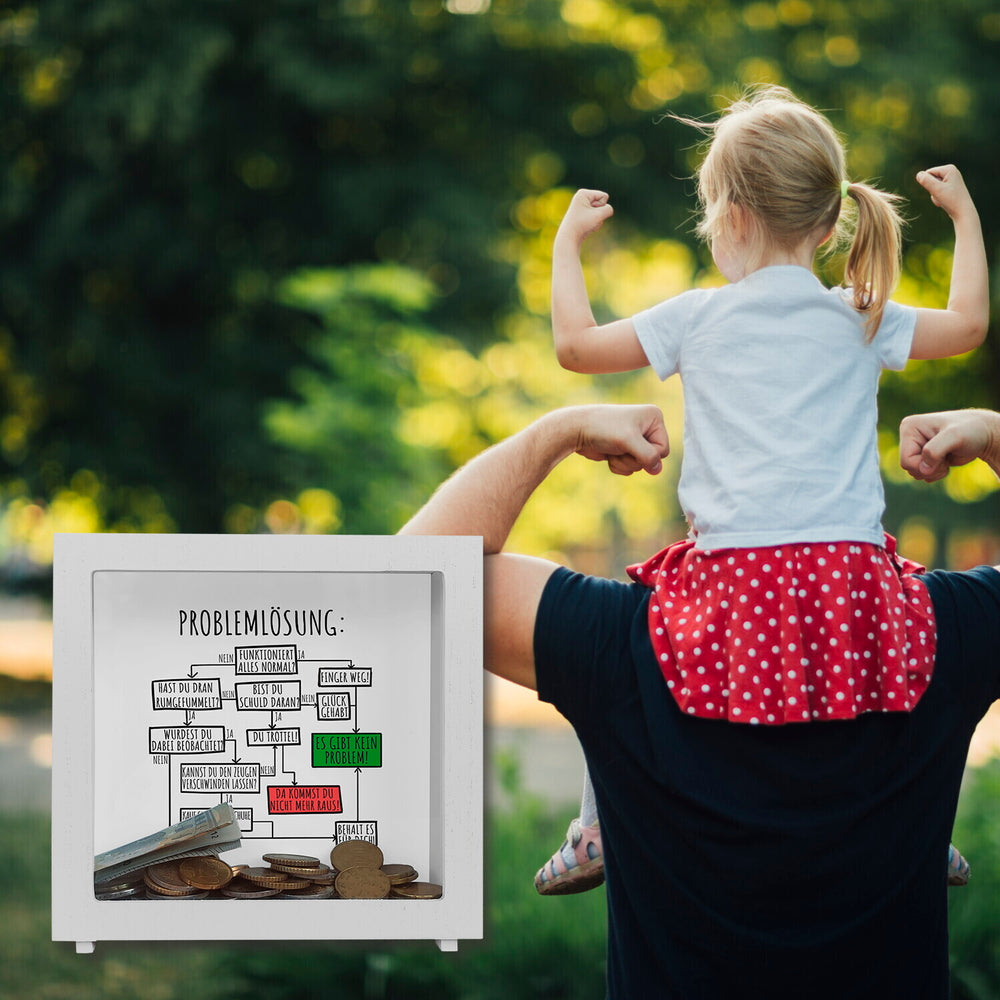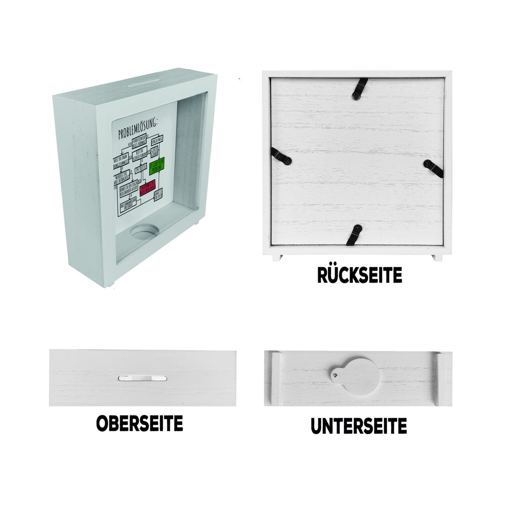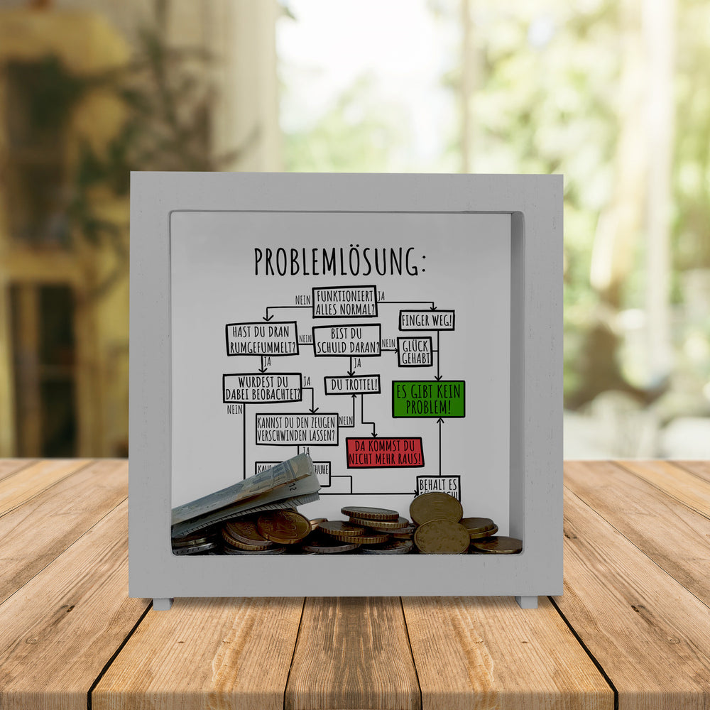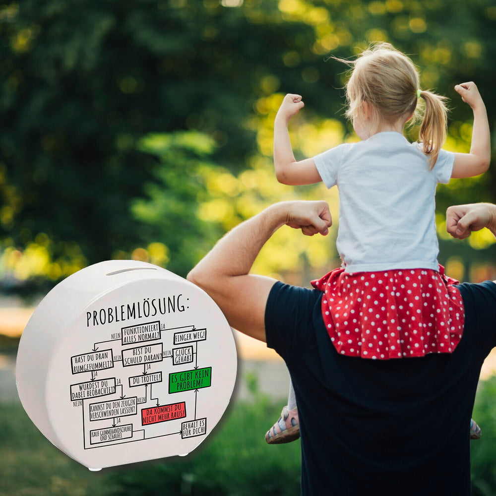 - Diese Spardose ist ein echtes Highlight für Humorliebhaber! Mit einem witzigen Flussdiagramm zur Problemlösung bringt es sicherlich jeden zum Schmunzeln. Der lustige Spruch "Es gibt keine Problem!" ziert die Spardose in klaren, markanten Buchstaben und sorgt garantiert für gute Laune auf jedem Schreibtisch oder Regal.