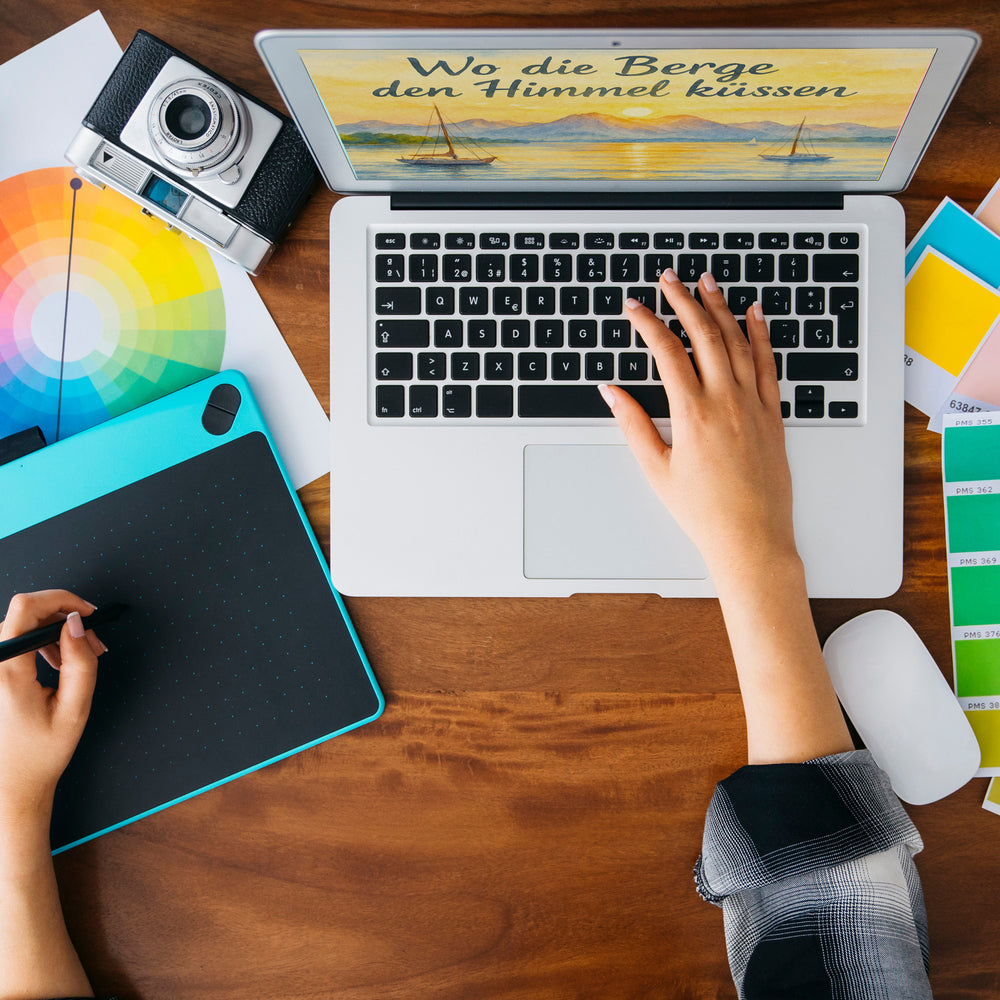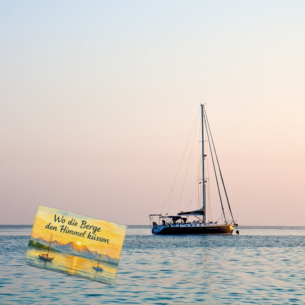 - Der Alpenblick Starnberger See Magnet zeigt ein atemberaubendes Aquarell eines Sonnenuntergangs über einer Berglandschaft. Goldene und orangene Töne zieren den Himmel, während die Berge und das Wasser in tiefen Blau- und Grüntönen leuchten. Zwei Segelboote segeln sanft über das Wasser, eingefasst von grüner Vegetation, und der Spruch „Wo die Berge den Himmel küssen“ rundet das Kunstwerk ab.