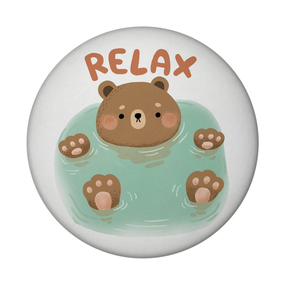 - Stell dir einen Bären vor, der sich im Pool entspannt – genau das vermittelt unser runder Magnet mit dem Spruch „Relax“. Perfekt für den Kühlschrank oder das Büro, zieht dieser niedliche Bär alle Blicke auf sich und zaubert dir ein Lächeln ins Gesicht.