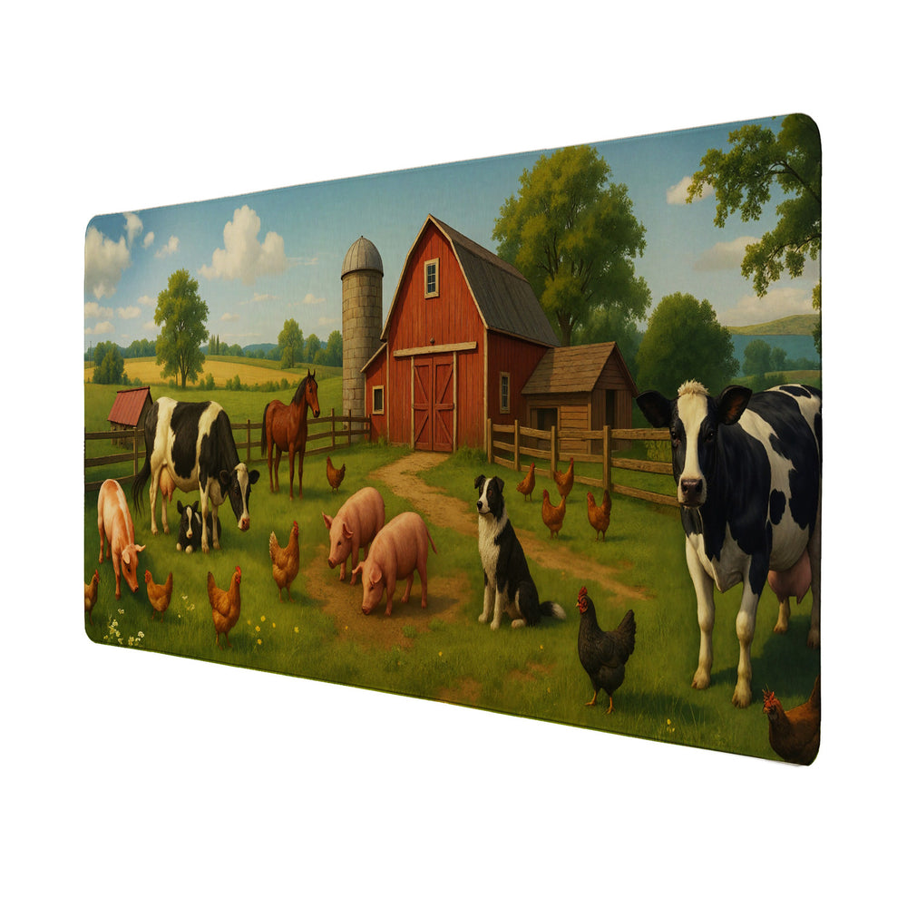 • Diese Schreibtischunterlage zeigt eine idyllische Bauernhofszene voller Leben. Im Mittelpunkt steht eine rote Scheune mit Doppel-Holztüren und einem grauen Silo. Ein braunes Pferd, ein Border Collie, Schweine und eine Milchkuh sind eingebettet in eine farbenfrohe Landschaft aus grünem Gras und einem strahlend blauen Himmel.