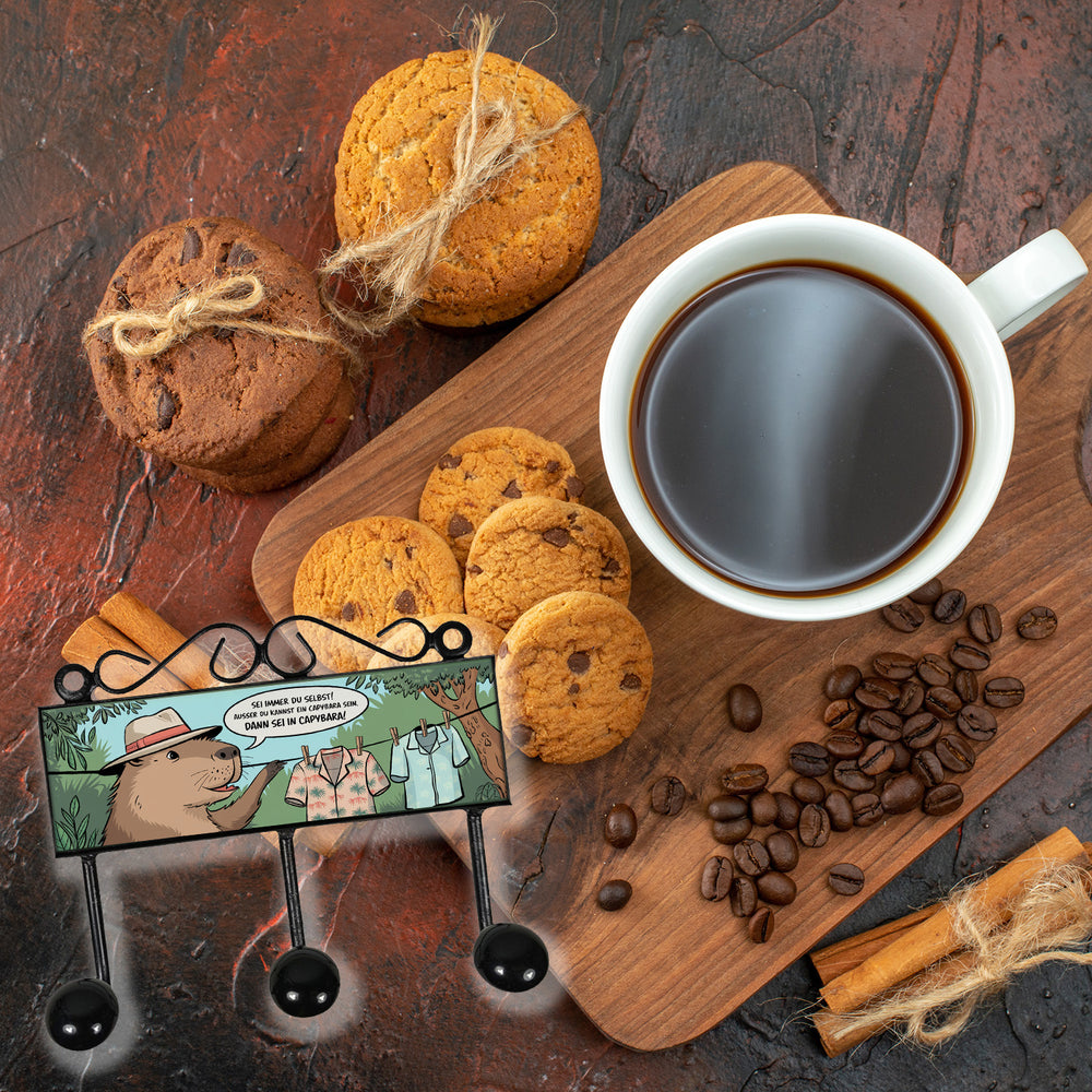 Verleihen Sie Ihrem Zuhause einen charmanten Hauch Abenteuer mit unserer Capybara Kleiderhaken Leiste! Mit drei robusten Haken bietet sie nicht nur Platz für Ihre Lieblingsjacken, Taschen und Hüte, sondern auch für ein Lächeln im Alltag. Dieses originelle Accessoire zeigt ein freches Capybara, stilvoll im Hut, das sein hawaiianisches Hemd im satten Waldgrün präsentiert, während es die humorvolle Botschaft „Sei immer du selbst! Außer du kannst ein Capybara sein. Dann sei ein Capybara!“ verkündet.Perfekt für Liebhaber von Tieren, Comics und Humor – diese Kleiderleiste schafft es, Funktionalität und Spaß auf wunderbar charmante Weise zu vereinen. Egal ob im Flur, im Schlafzimmer oder im Kinderzimmer, unser Capybara sorgt für eine fröhliche Atmosphäre und eine tägliche Erinnerung daran, sich selbst und das Leben nicht allzu ernst zu nehmen.Auf der Suche nach einem einzigartigen Geschenk für Freunde oder Familie? Diese Hakenleiste ist Ihre erste Wahl! Sie kombiniert Nutzwert mit einem frechen Augenzwinkern, das garantiert in Erinnerung bleibt. Luftig, liebevoll und mit einem Augenzwinkern designed, bietet unser Capybara nicht nur stilvollen Haken, sondern auch ein Stück munterer Gelassenheit, das jedes Zuhause bereichert. Genießen Sie jeden Tag ein bisschen mehr Lächeln mit unserem humorvollen Capybara!