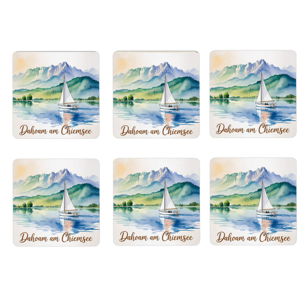 - Dieses 6er Set von Untersetzern bietet Ihnen ein bezauberndes Aquarellmotiv. Es zeigt ein traditionelles Segelboot, das majestätisch den ruhigen Chiemsee durchquert, eingerahmt von den eindrucksvollen bayerischen Alpen und zarten Farbverläufen. Der handgeschriebene Schriftzug "Dahoam am Chiemsee" verleiht jedem Stück einen heimischen Charme.