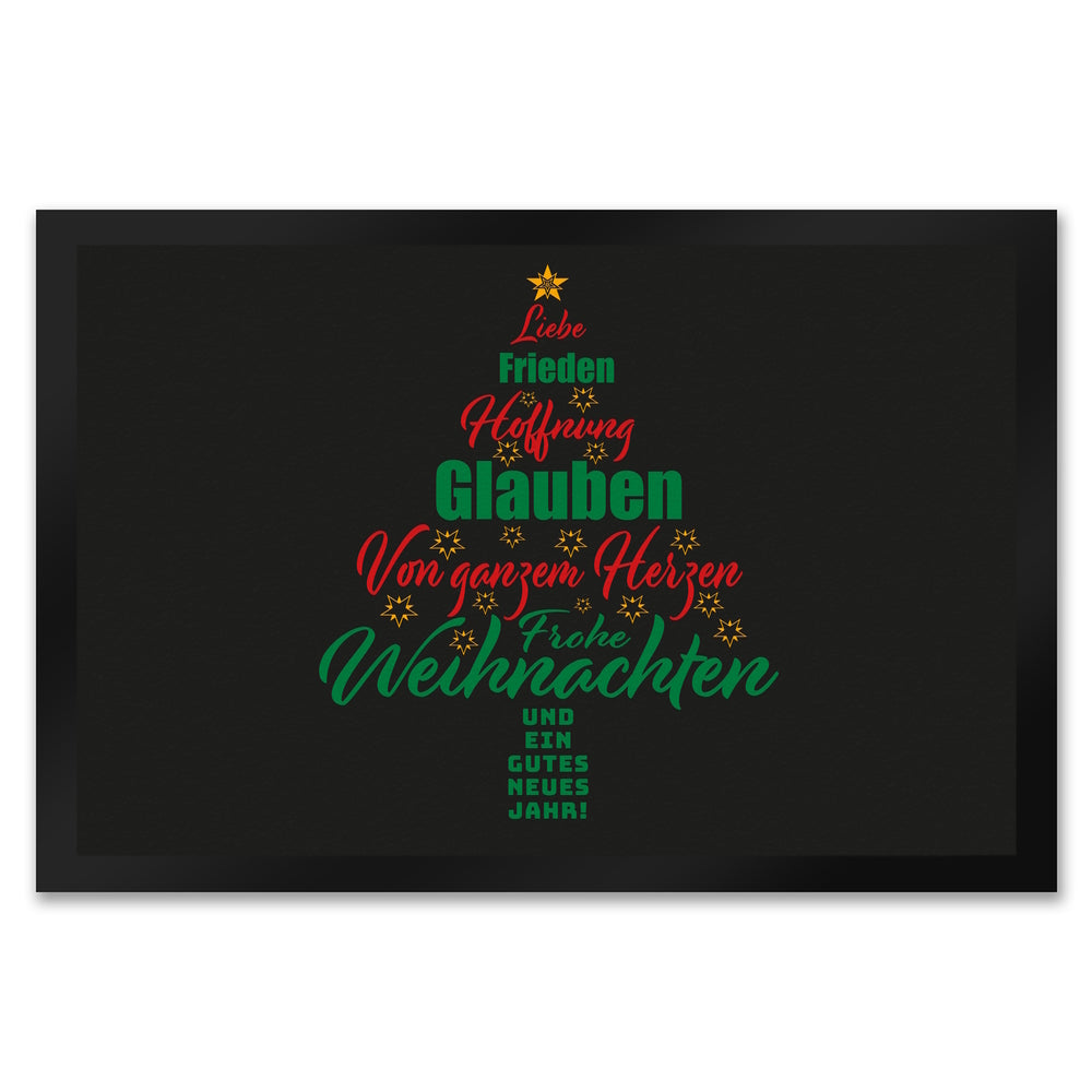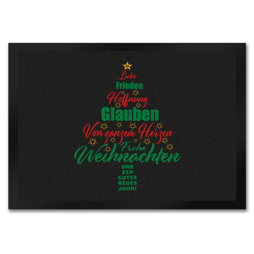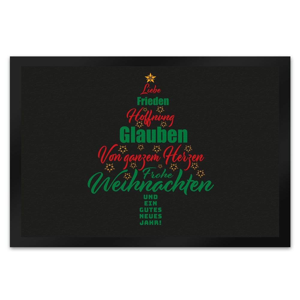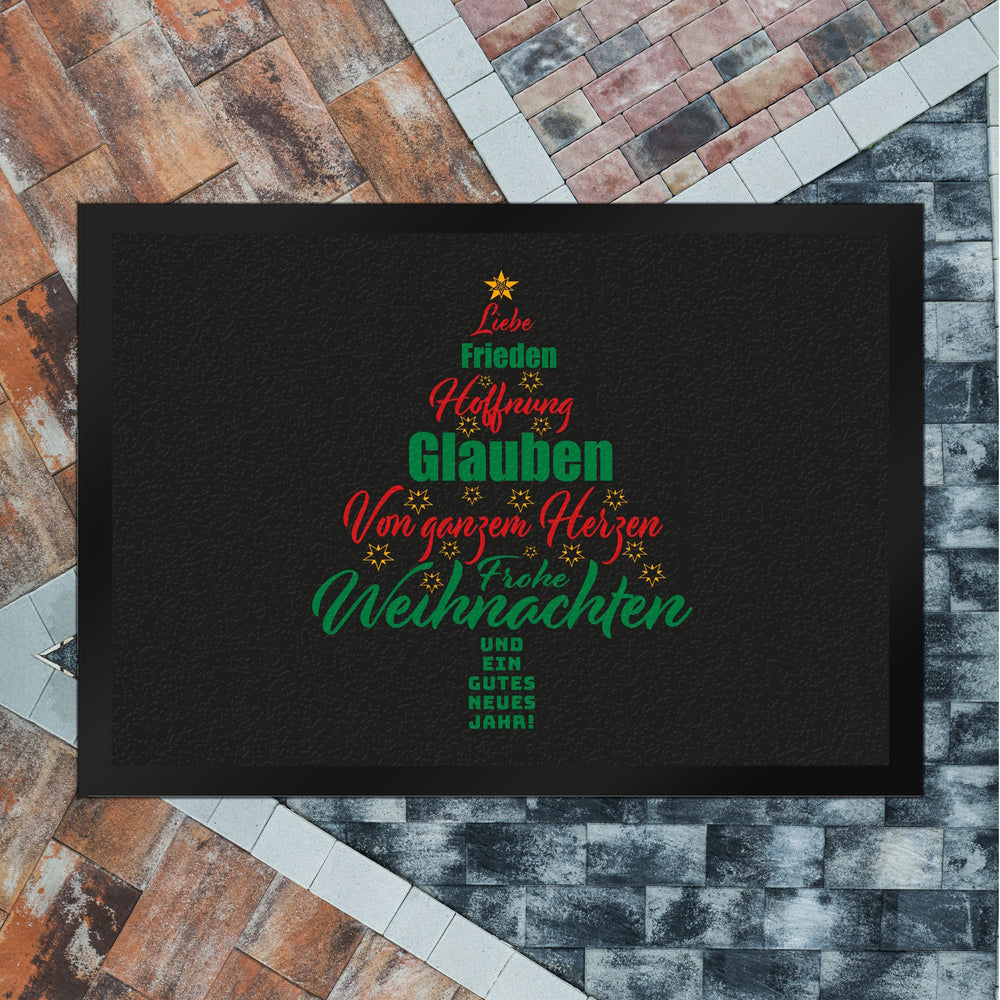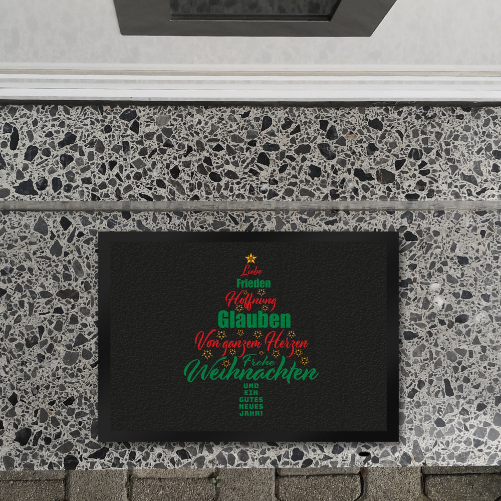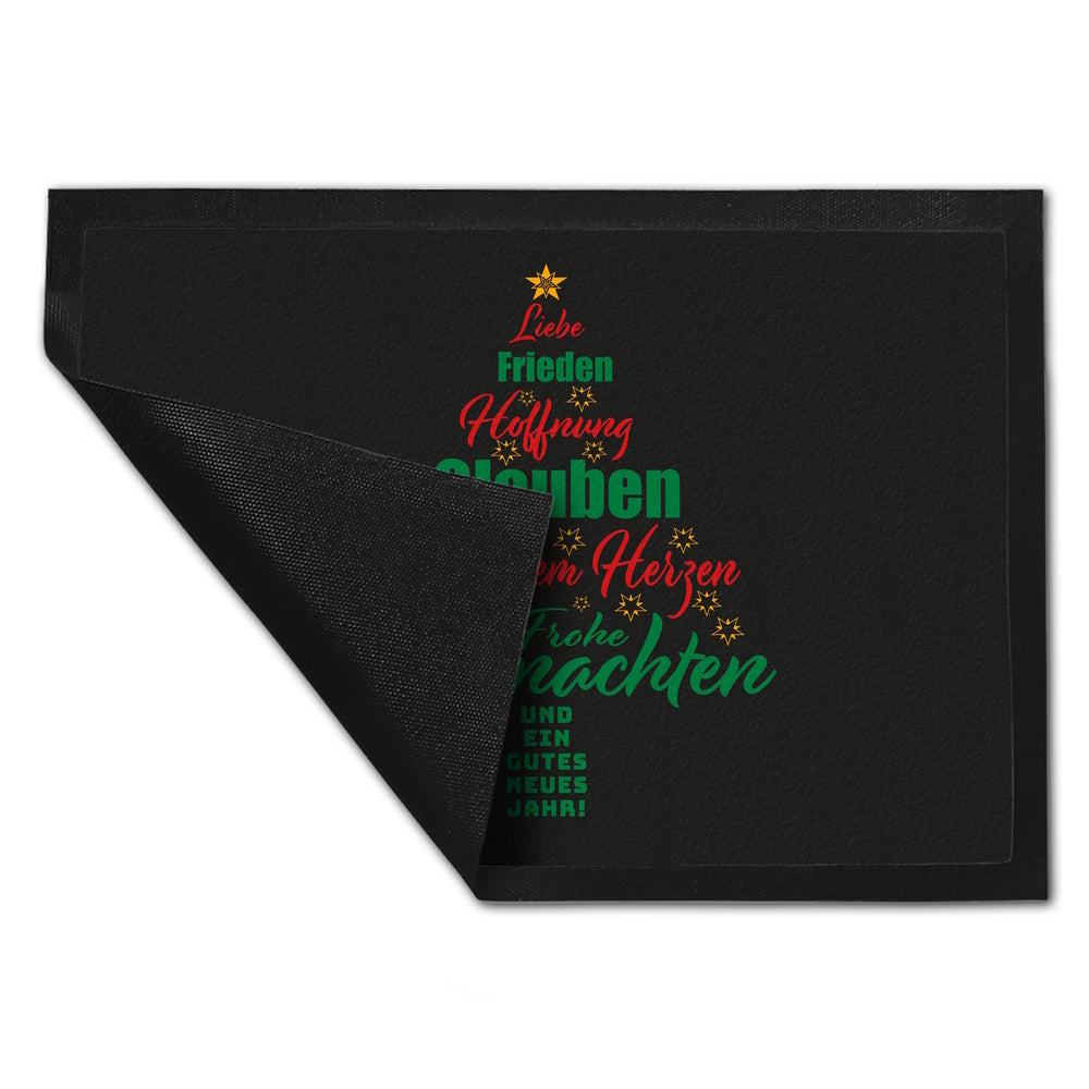 - Du suchst nach einer Fußmatte, die den Weihnachtsmann vor Neid erblassen lässt? Unsere Christbaum Fußmatte mit dem Spruch "Frohe Weihnachten und gutes neues Jahr" ist der festliche Hingucker für deine Tür! Mit einem aus Wörtern geformten Weihnachtsbaum und leuchtenden Sternen verbreitet sie pure Festtagsstimmung.