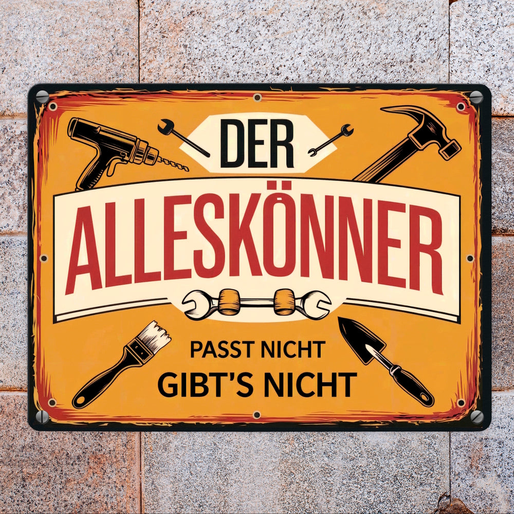 - Unser Metallschild im Vintage-Stil ist ein echter Hingucker! Mit seinem sonnengelben Hintergrund und dem markanten Spruch "DER ALLESKÖNNER" zieht es alle Blicke auf sich. Ein Muss für jede Werkstatt!
