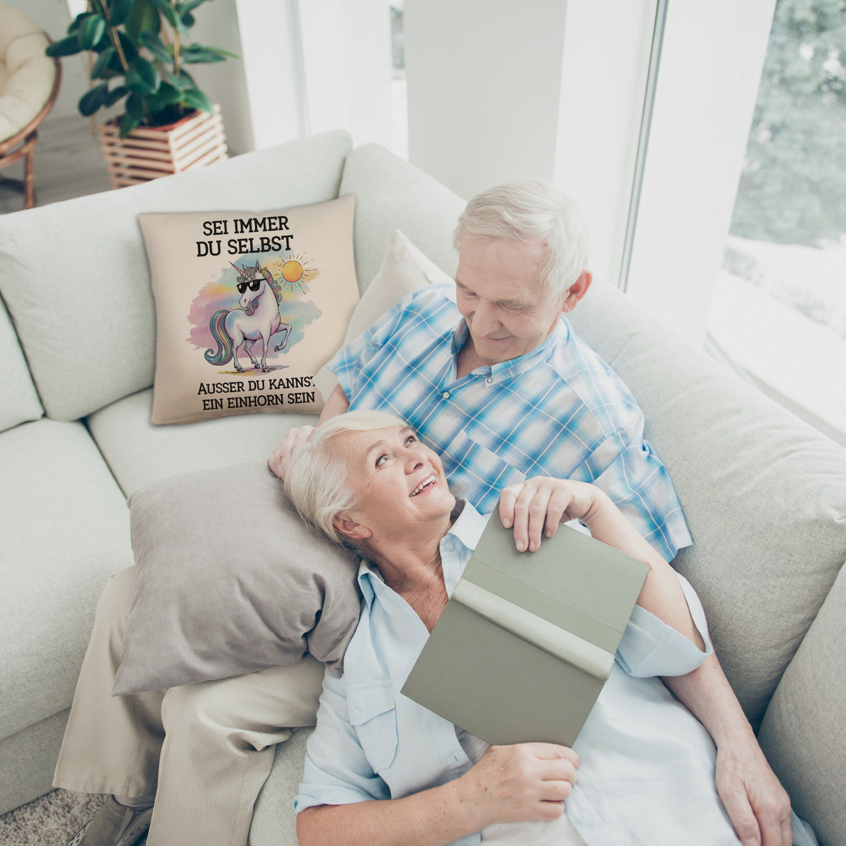 Bist du bereit, deinen Wohnraum in ein wahres Wunderland der Fantasie zu verwandeln? Dann greif zu unserem Einhorn mit Sonnenbrille Kissen! Dieses liebevoll gestaltete Kissen vereint Coolness, Charme und eine ordentliche Portion Humor. Egal ob Kinderzimmer, Büro oder Wohnzimmer – unser Einhorn verleiht jedem Raum das gewisse Etwas!Der freche Vierbeiner trägt eine stylische Sonnenbrille und steht im Rampenlicht unter einer strahlenden Sonne. Begleitet von dem motivierenden Spruch: Sei immer du selbst, außer du kannst ein Einhorn sein. Dann sei ein Einhorn! – wer kann da noch widerstehen?Du suchst Einzigartigkeit? Unser Einhorn-Kissen kommt in verschiedenen Ausführungen: als Standard-Kissen, mit edler Leinenoptik oder extra-flauschig zum Kuscheln. Hochwertig bedruckt in Deutschland ist jedes Kissen ein Unikat. Ein Must-Have für alle, die das Besondere lieben und dabei nicht auf Qualität verzichten möchten.Schrenke dies als Geschenk oder gönn dir selbst den magischen Hauch. Ob Geburtstag, Weihnachten oder ein besonderes Dankeschön – mit unserem Kissen liegst du immer richtig. Genieße pure Entspannung und lasse die magische Aura des Einhorns auf dich wirken. Schnapp dir jetzt das Einhorn-Kissen und setze ein Zeichen für Originalität und Lebensfreude!