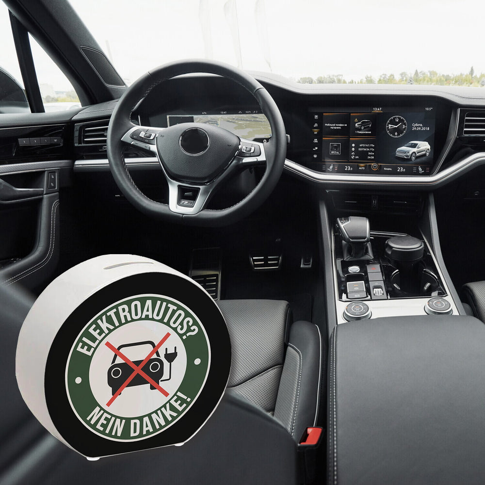- Die lustige Spardose präsentiert ein witziges Statement für alle Skeptiker: Ein durchgestrichenes Elektroauto ziert den grünen Aufkleber auf schwarzem Hintergrund. Mit auffälligen weißen Schriftzügen "ELEKTROAUTOS? NEIN DANKE!" bringt diese Sparbüchse Humor und Haltung ins Regal.