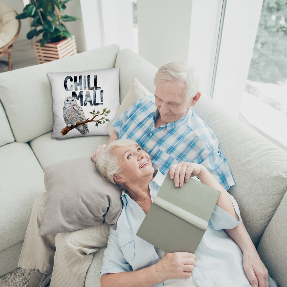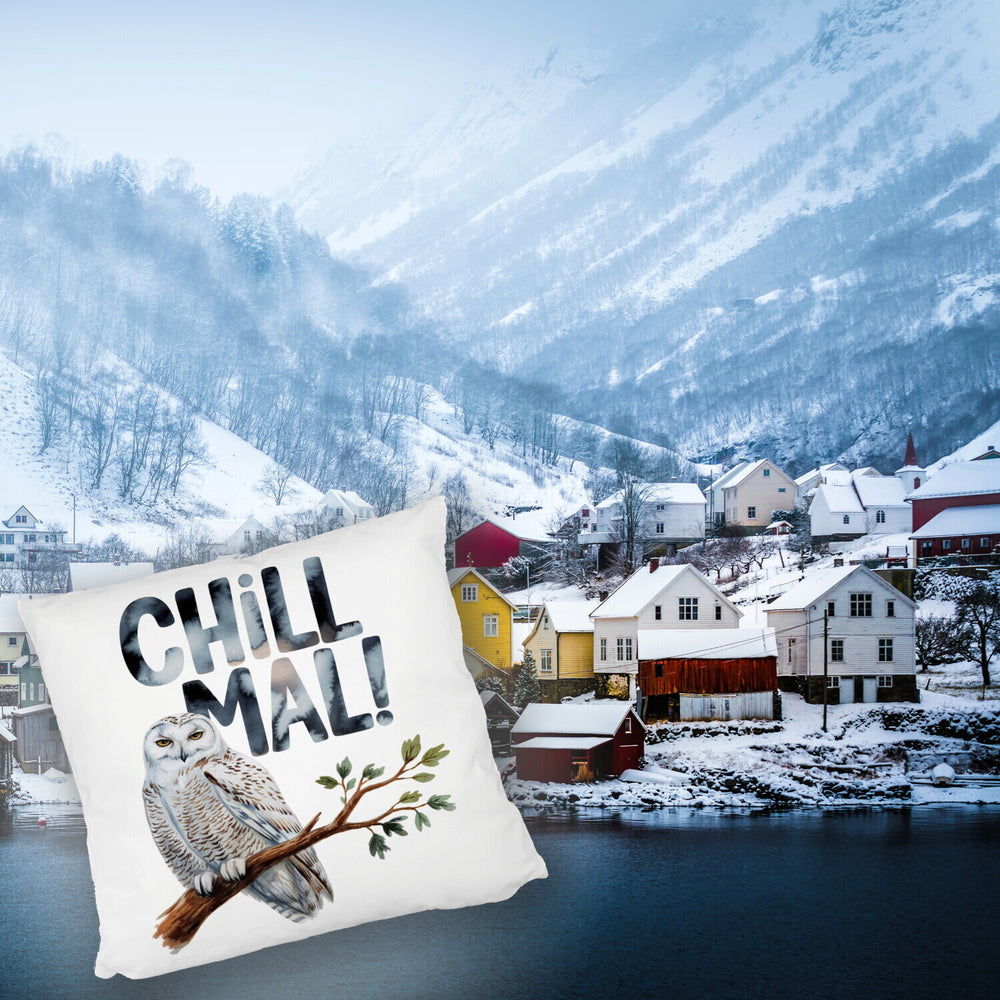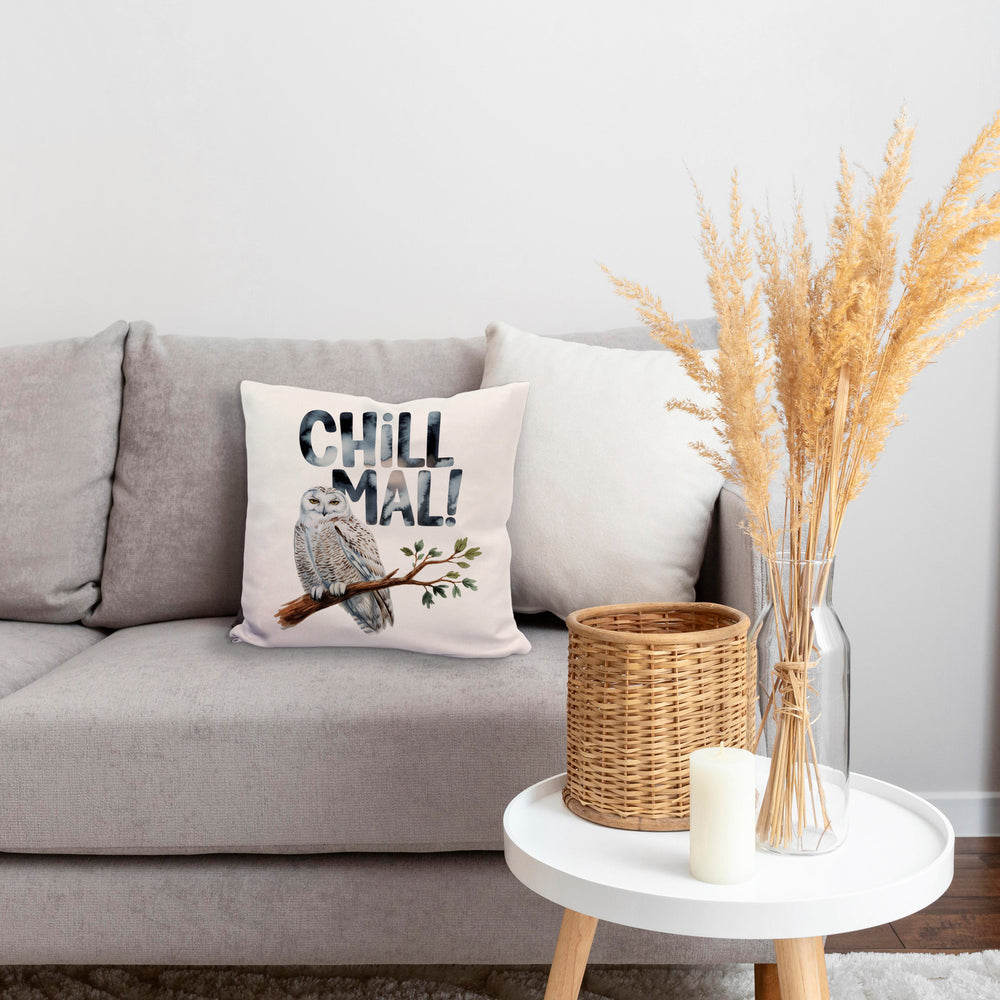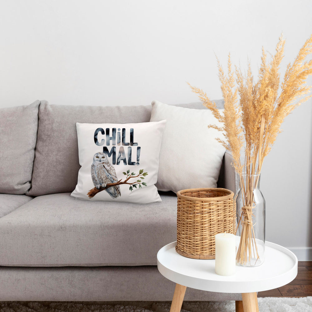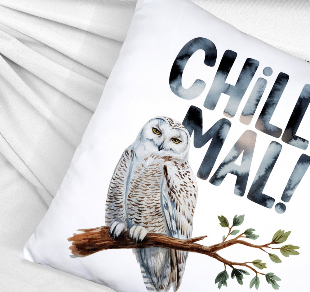 - Das Kissen zeigt eine entspannte Schneeeule mit weißen Federn und markanten gelben Augen, die auf einem Ast mit grünen Blättern sitzt. Der Hintergrund ist weiß, verziert mit pastelligen Aquarellfarben und dem fetten Schriftzug "CHILL MAL!". Ein echter Hingucker für jede Couch!