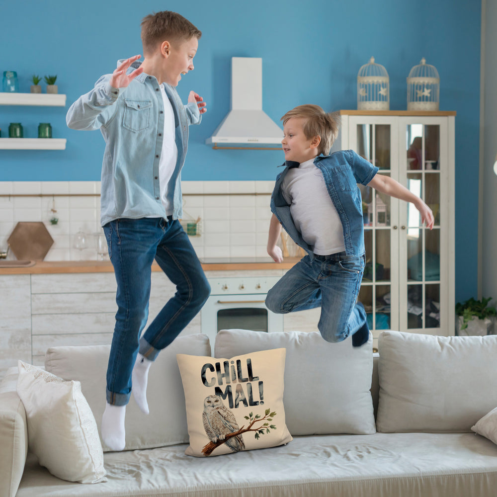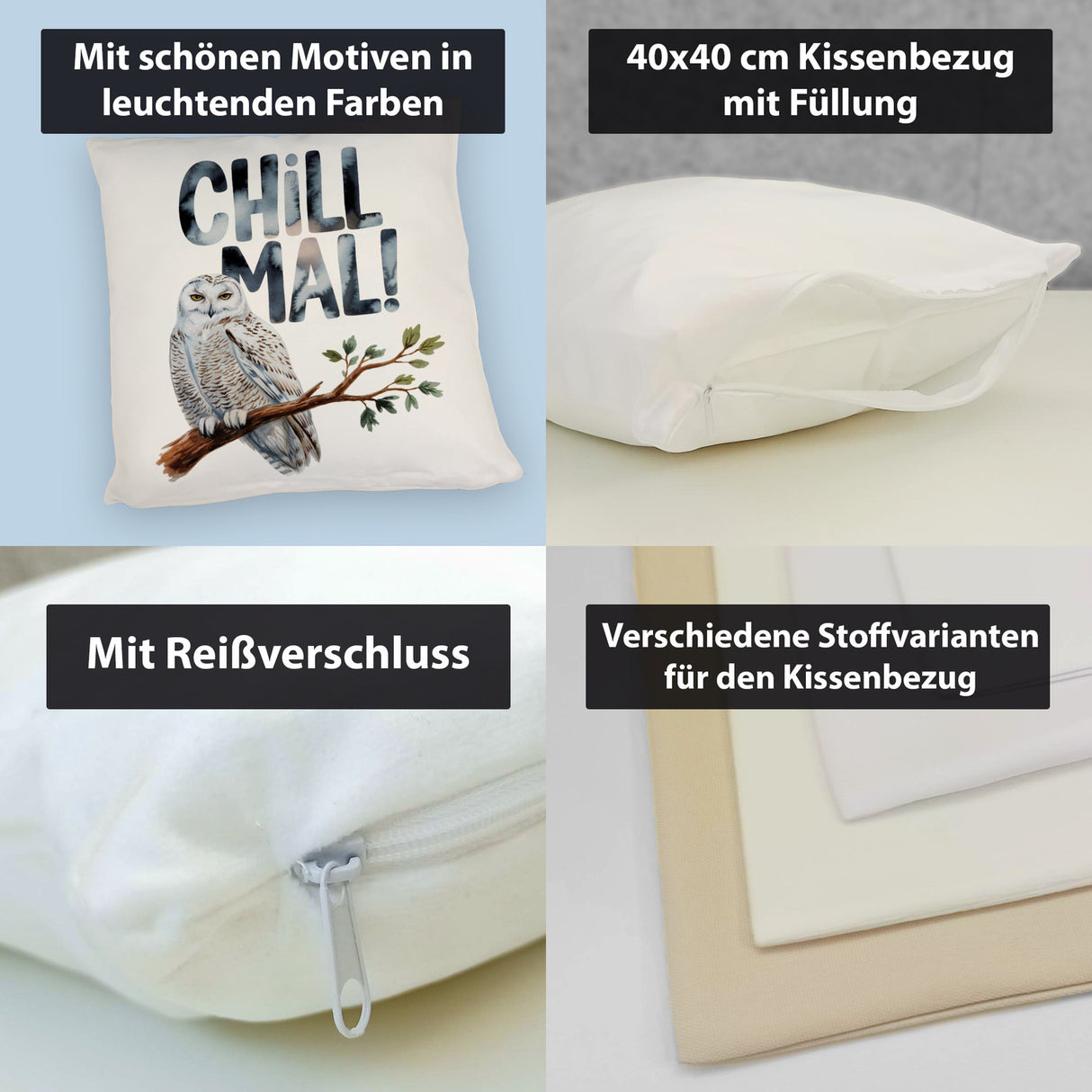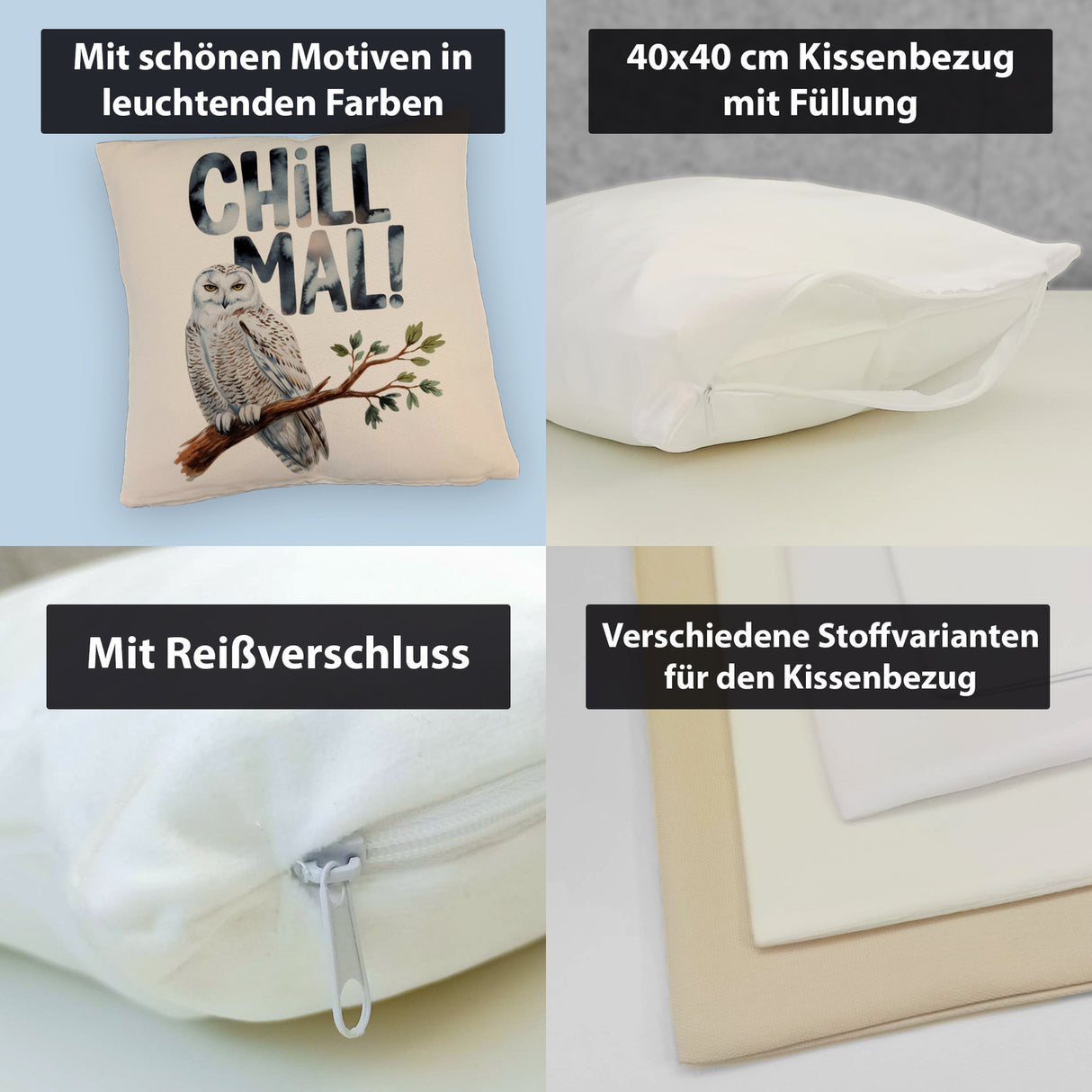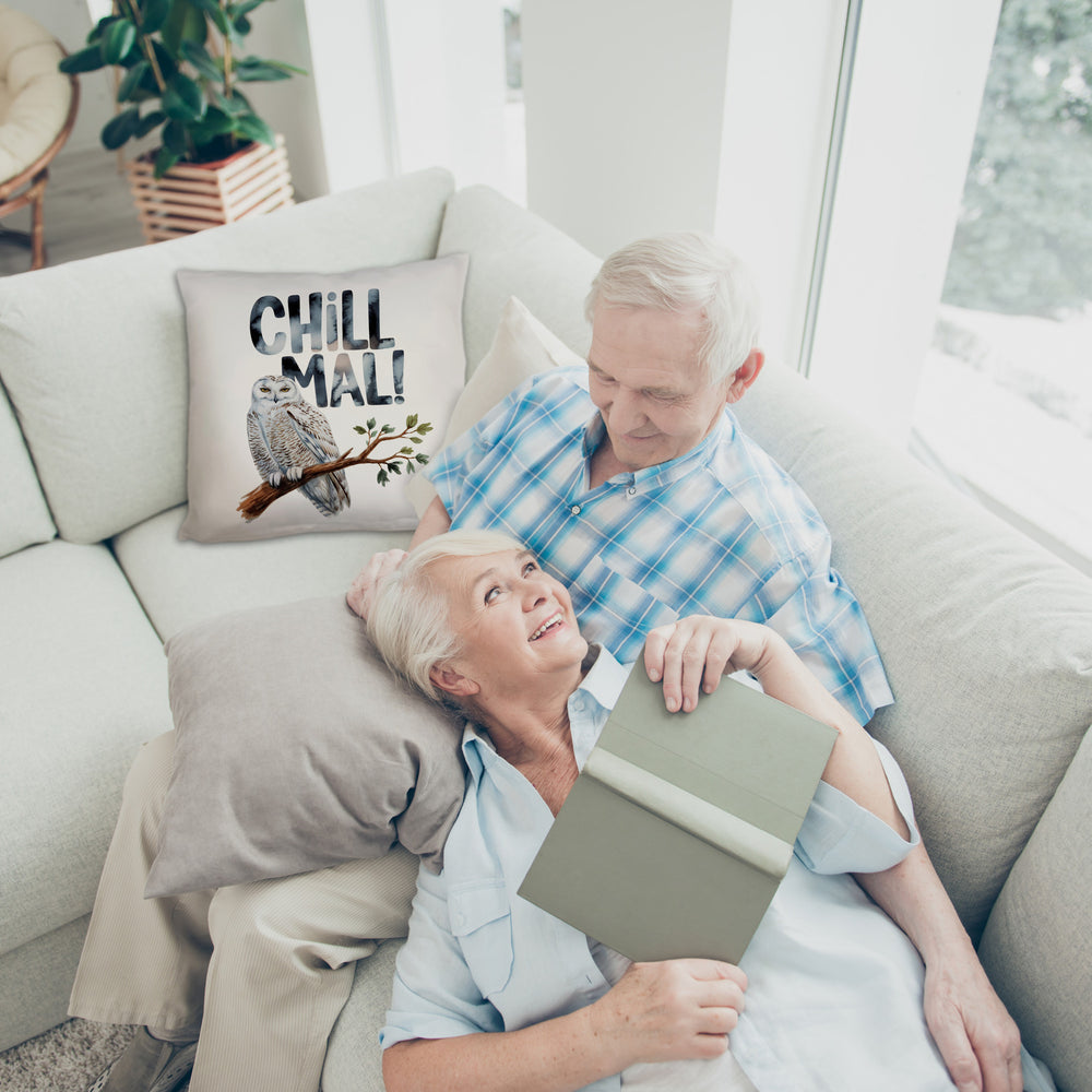 - Das Kissen zeigt eine entspannte Schneeeule mit weißen Federn und markanten gelben Augen, die auf einem Ast mit grünen Blättern sitzt. Der Hintergrund ist weiß, verziert mit pastelligen Aquarellfarben und dem fetten Schriftzug "CHILL MAL!". Ein echter Hingucker für jede Couch!