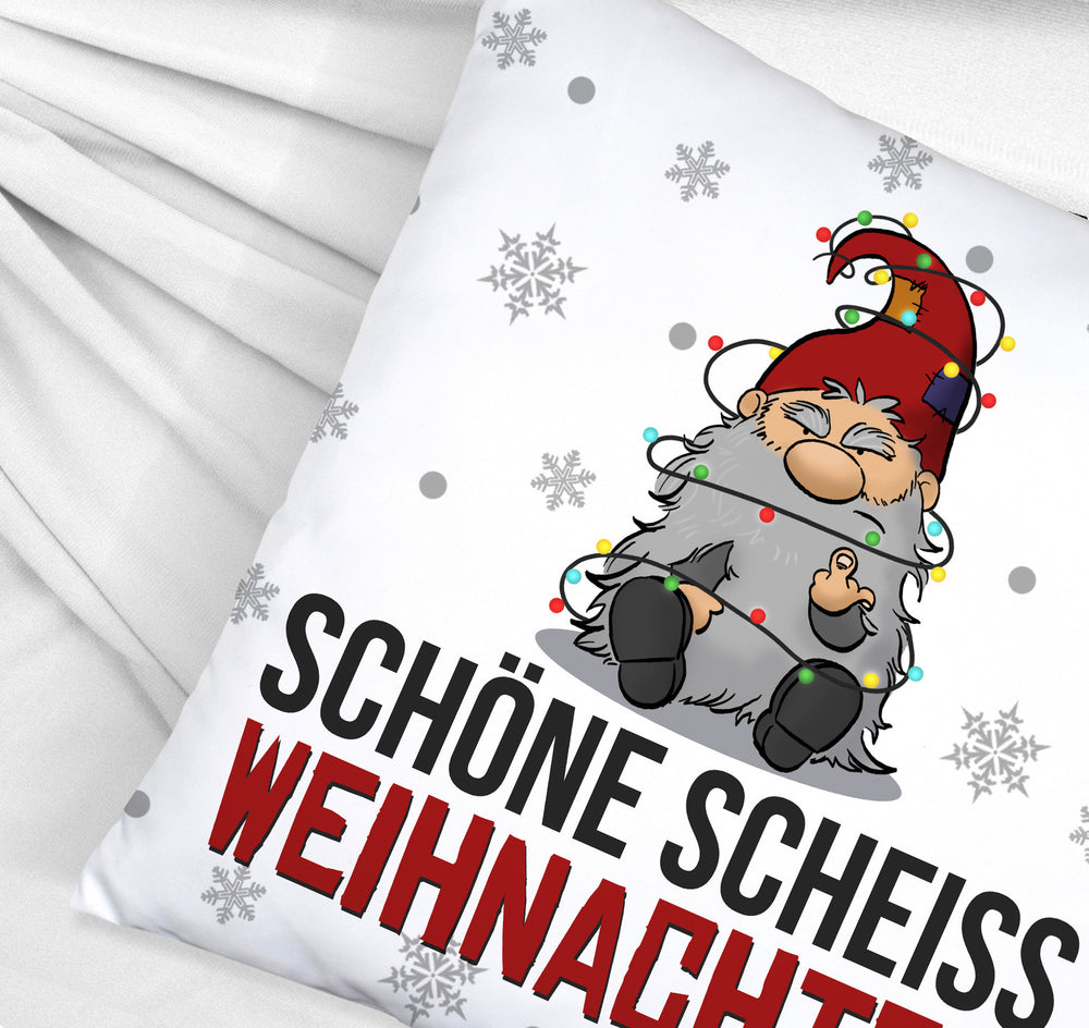 • 1x Grimmiger Wichtel Kissen mit Spruch Schöne scheiß Weihnachten in der gewählten Ausführung