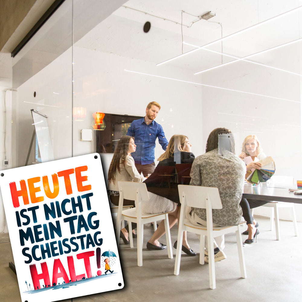 • Dieses Metallschild besticht durch ein witziges und buntes Design. Auf weißem Hintergrund prangt der Spruch: "HEUTE IST NICHT MEIN TAG SCHEISSTAG HALT!" in kräftigen Schattierungen von Orange, Blau und Rot. Eine Cartoon-Figur rennt unter einer Regenwolke, während alle anderen die Sonne genießen.