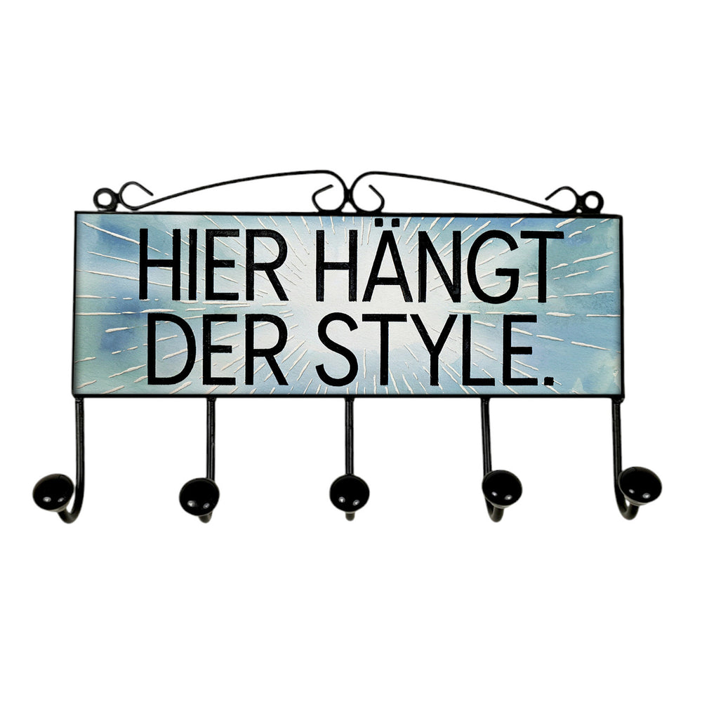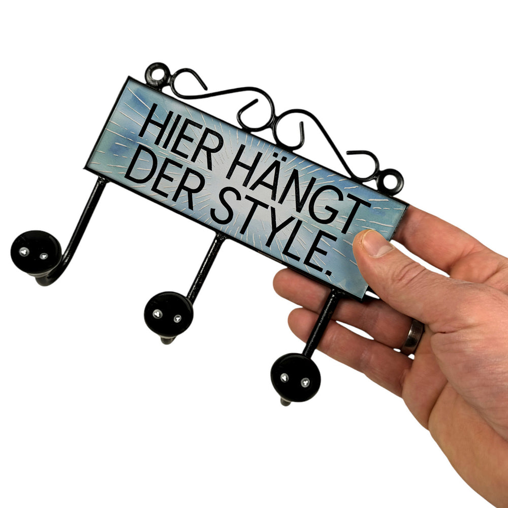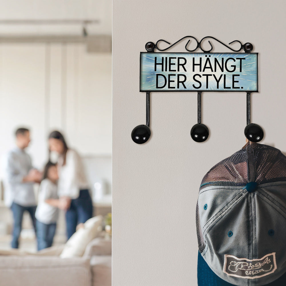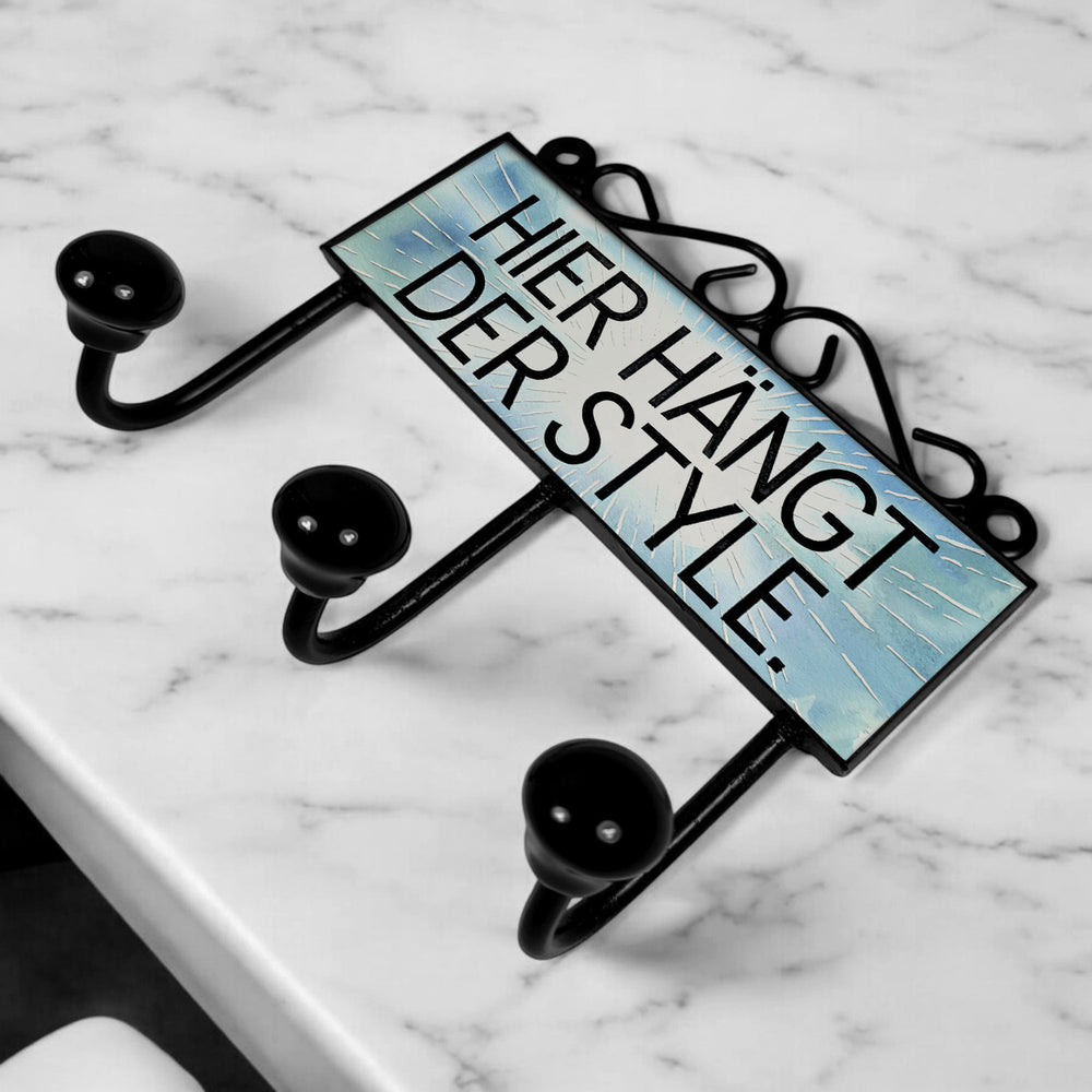 • Diese stilvolle Kleiderhakenleiste ist ein wahrer Blickfang! Mit einem beruhigenden blauen Aquarell-Farbverlauf und dem frechen Spruch "Hier hängt der Style" zieht sie alle Blicke auf sich. Die fetten schwarzen Buchstaben heben sich wunderbar ab und die weißen Linien bringen Dynamik ins Spiel. Perfekt für ein modisches Zuhause!