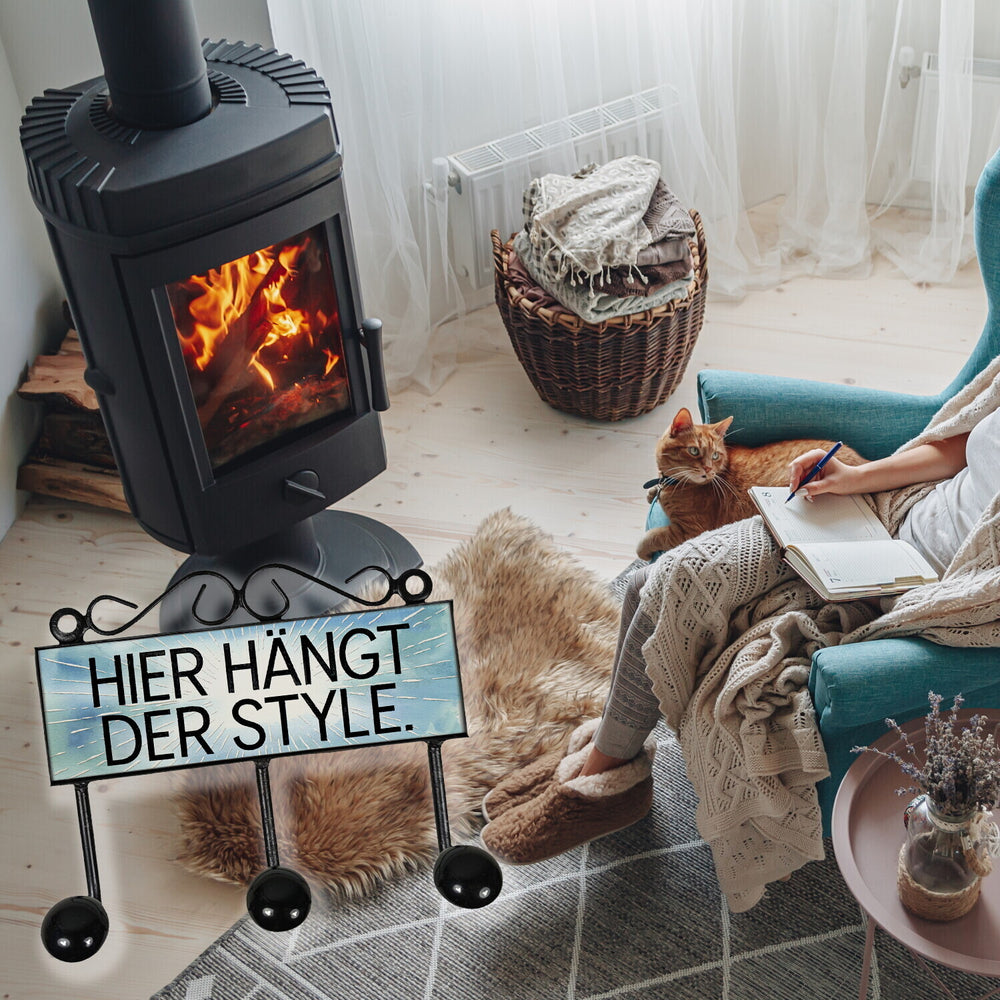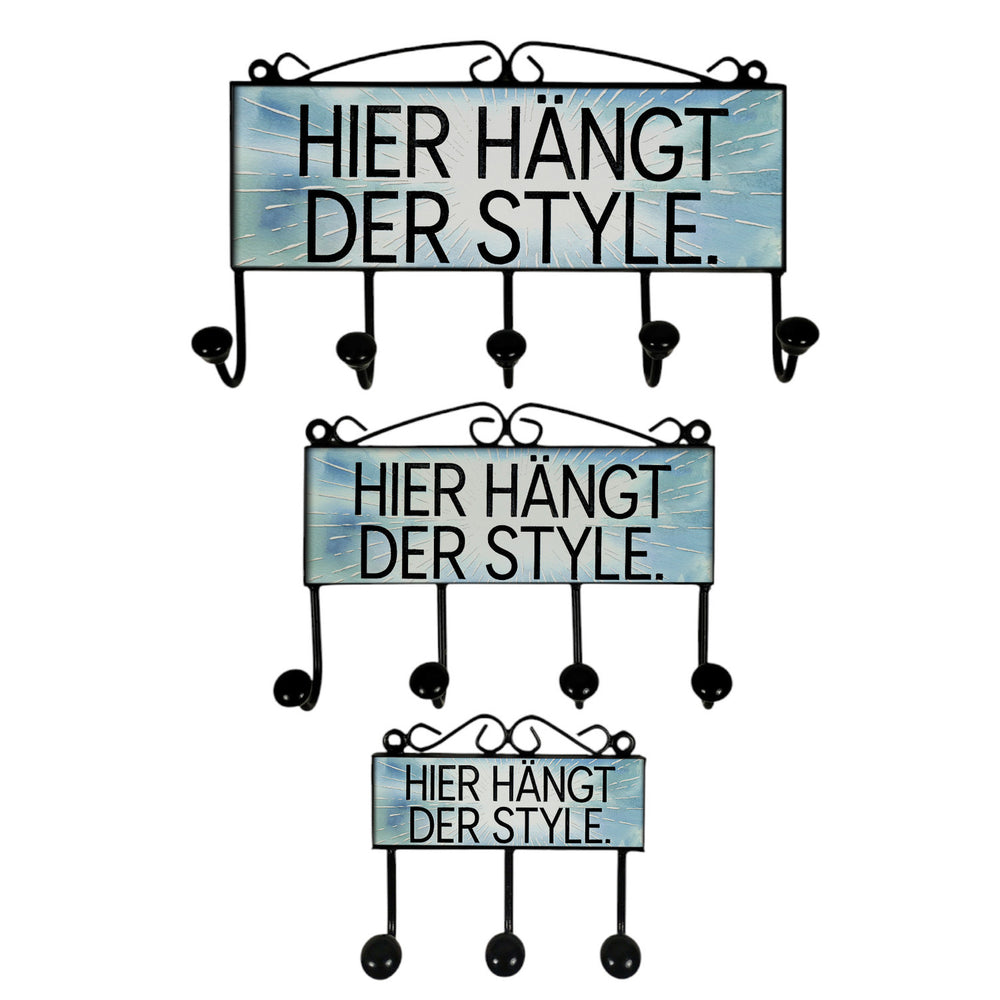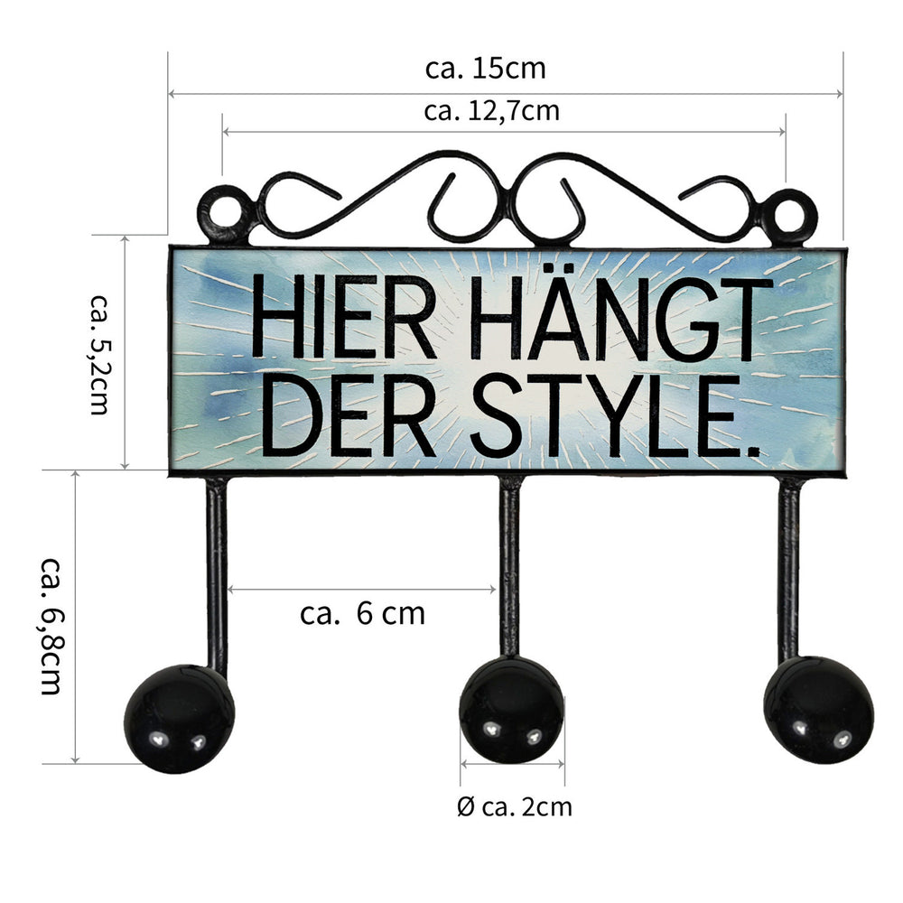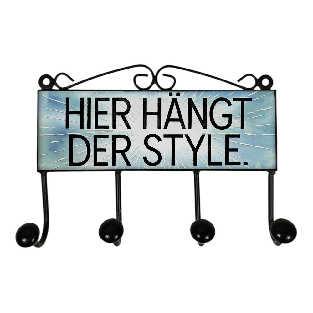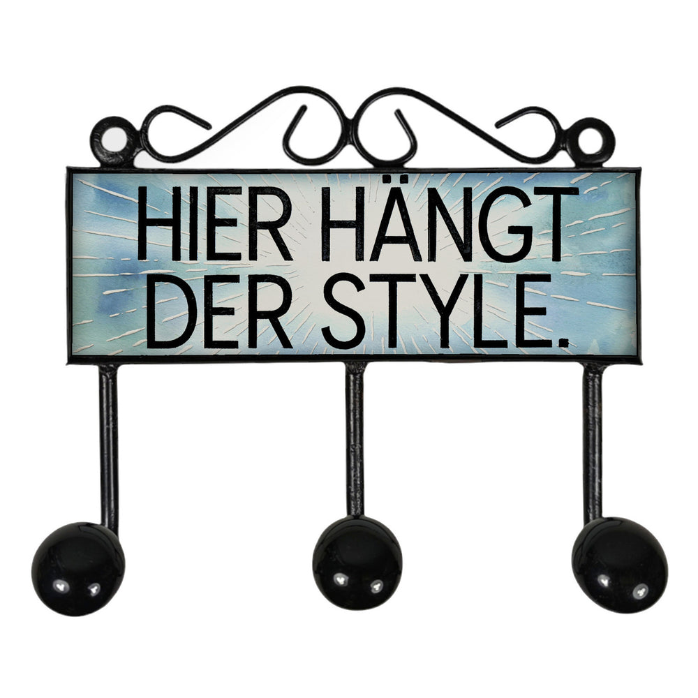 • Diese stilvolle Kleiderhakenleiste ist ein wahrer Blickfang! Mit einem beruhigenden blauen Aquarell-Farbverlauf und dem frechen Spruch "Hier hängt der Style" zieht sie alle Blicke auf sich. Die fetten schwarzen Buchstaben heben sich wunderbar ab und die weißen Linien bringen Dynamik ins Spiel. Perfekt für ein modisches Zuhause!