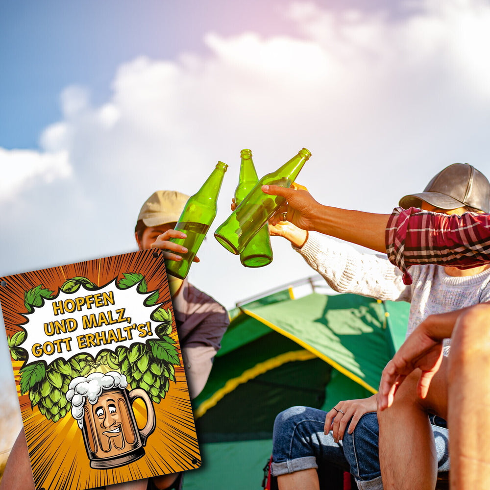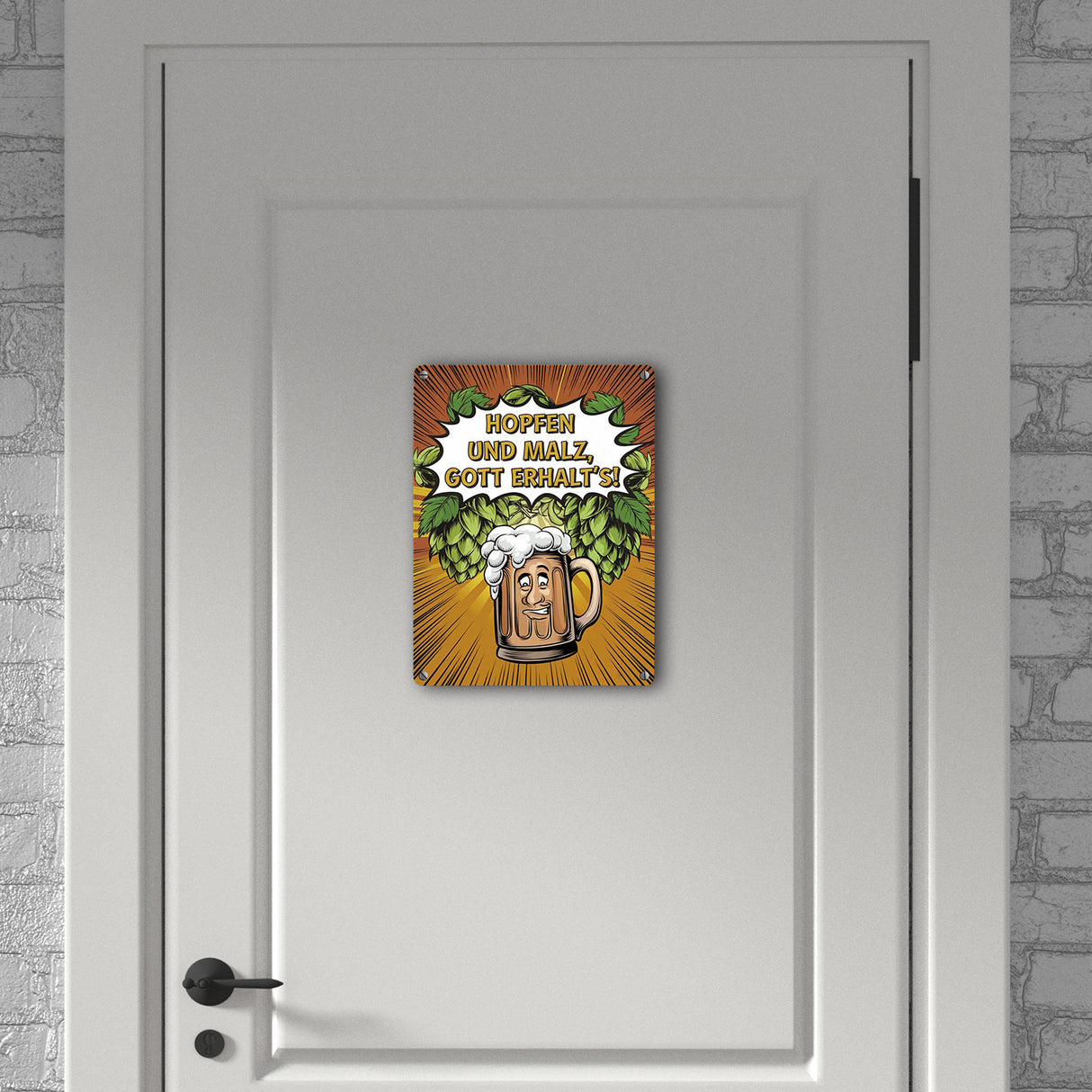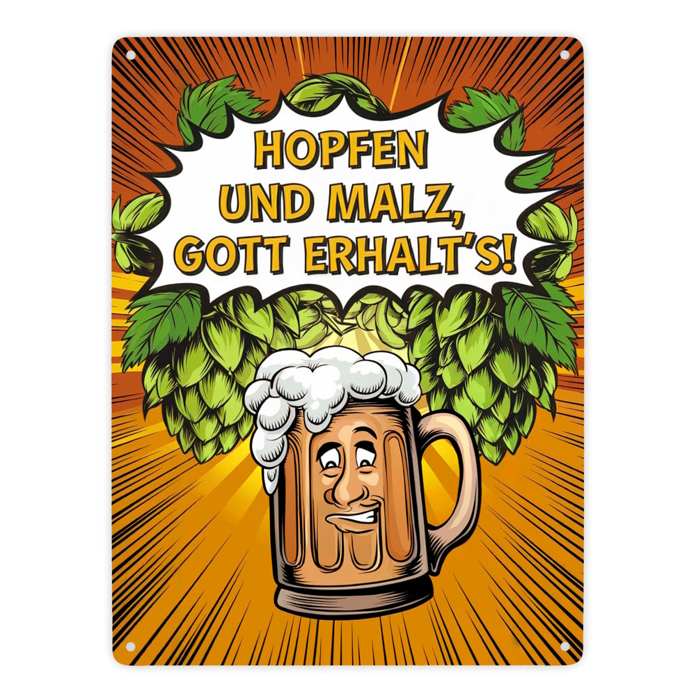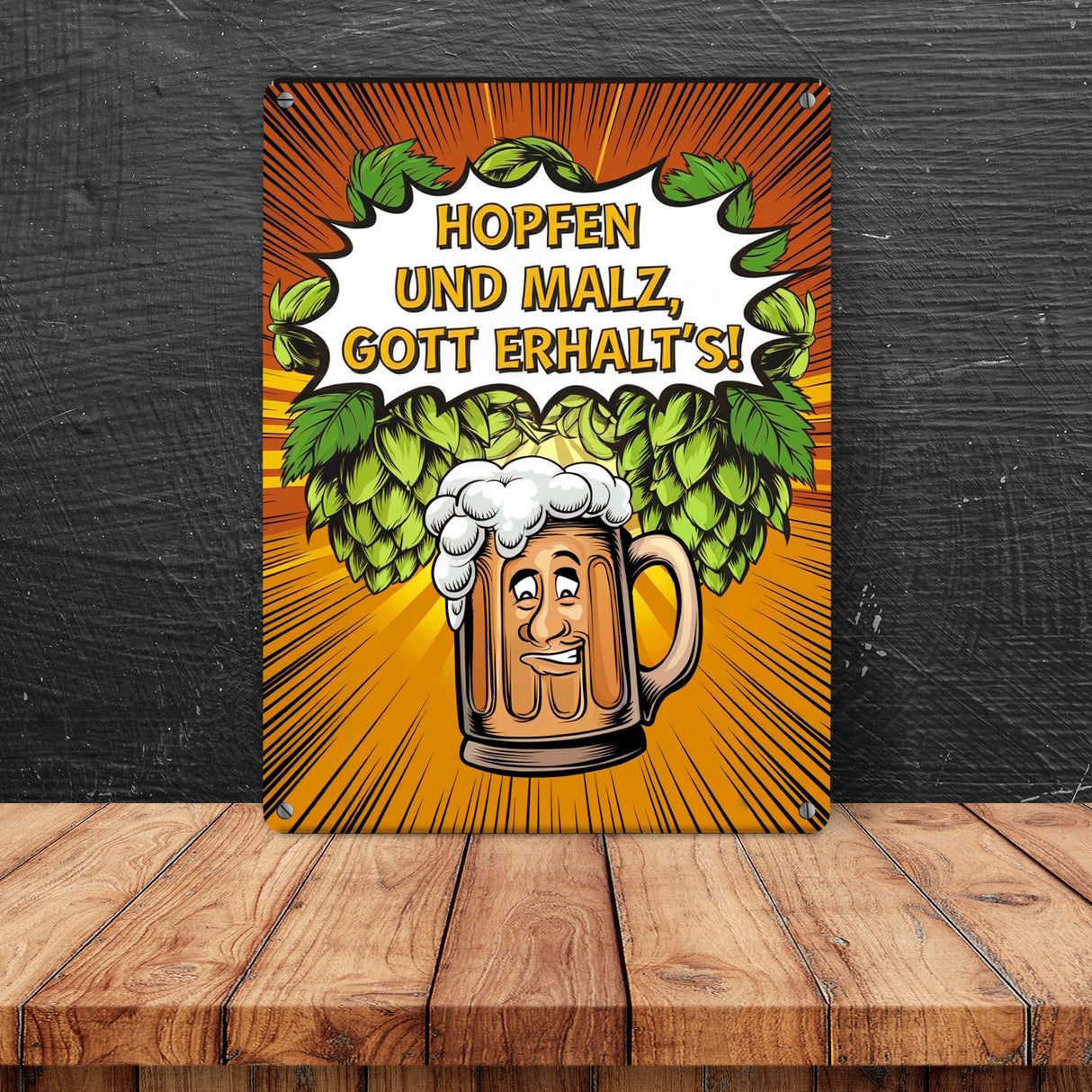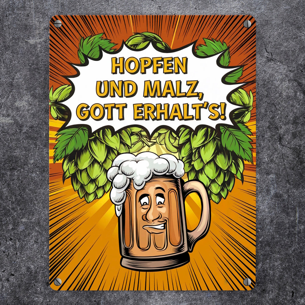 Hopfen und Malz, Gott erhalt's! Metallschild in 15x20 cm mit lustigem Bierkrug