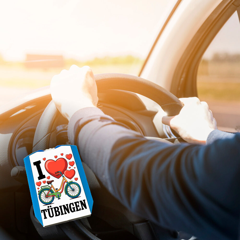 - Die "I Love Tübingen" Fahrrad Parkscheibe begeistert mit ihrem charmanten Comic-Fahrrad und einem großen Herzen, das den Schriftzug "I love Tübingen" umgibt. Der weiße Hintergrund lässt das Design strahlen und zieht alle Blicke auf sich. Ein witziges und zugleich liebevolles Souvenir für echte Tübingen-Fans!