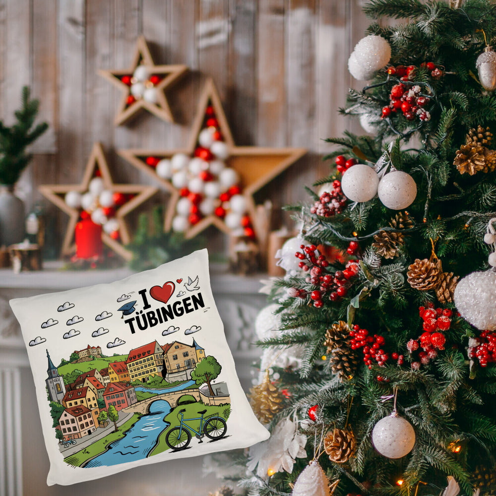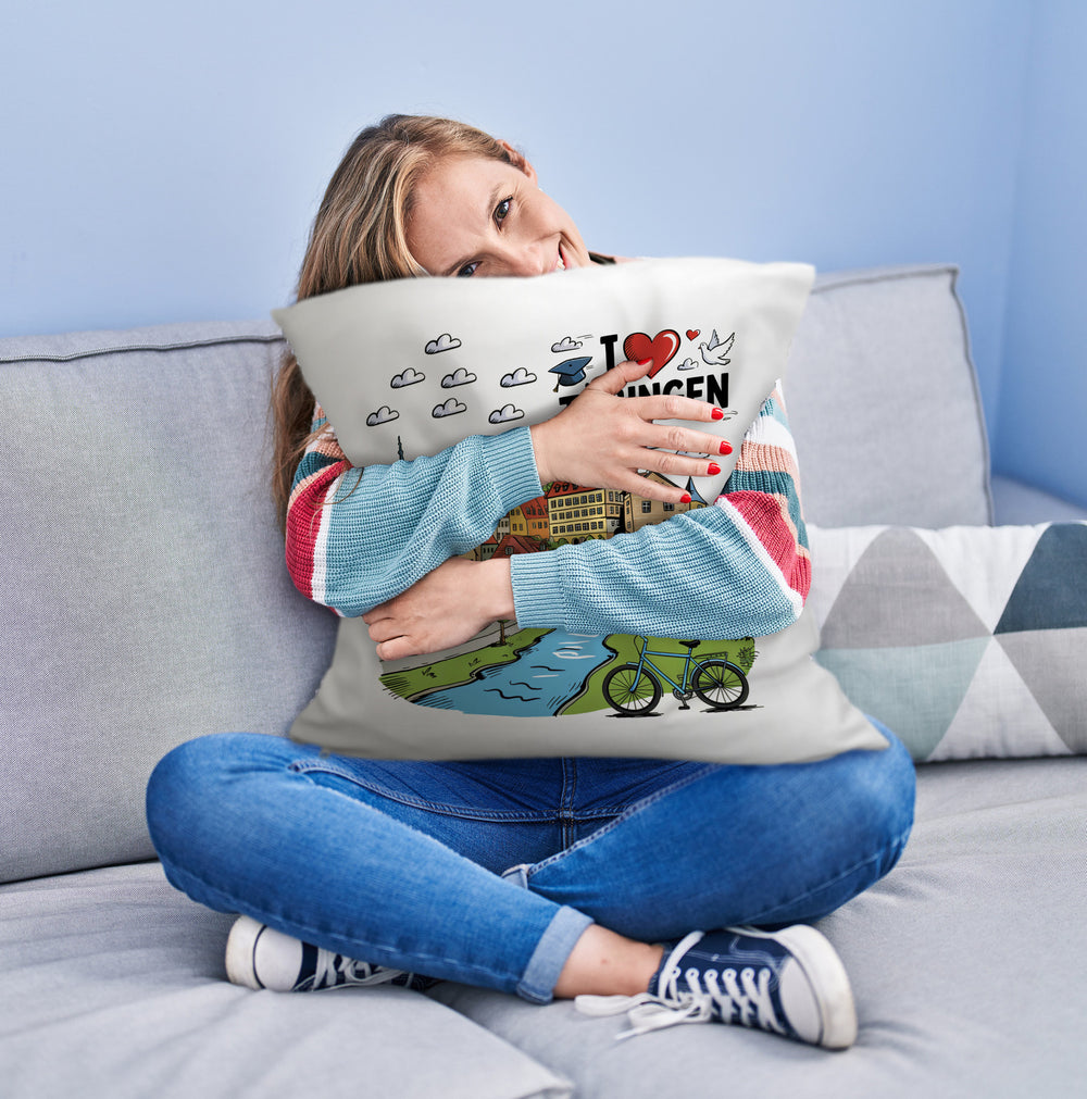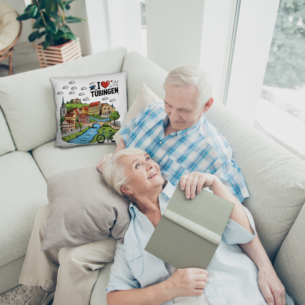 • Unser "I love Tübingen"-Kissen ist ein bunter Traum für die Couch! Mit dem kultigen Schriftzug, einem Herz und liebevoll gezeichneten Sehenswürdigkeiten wie dem Hölderlinturm, der Stiftskirche und dem Schloss Hohentübingen lässt dieses Comic-Design keinen Tübingen-Liebhaber kalt. Eine weiße Taube sorgt für den finalen Touch – einfach entzückend!