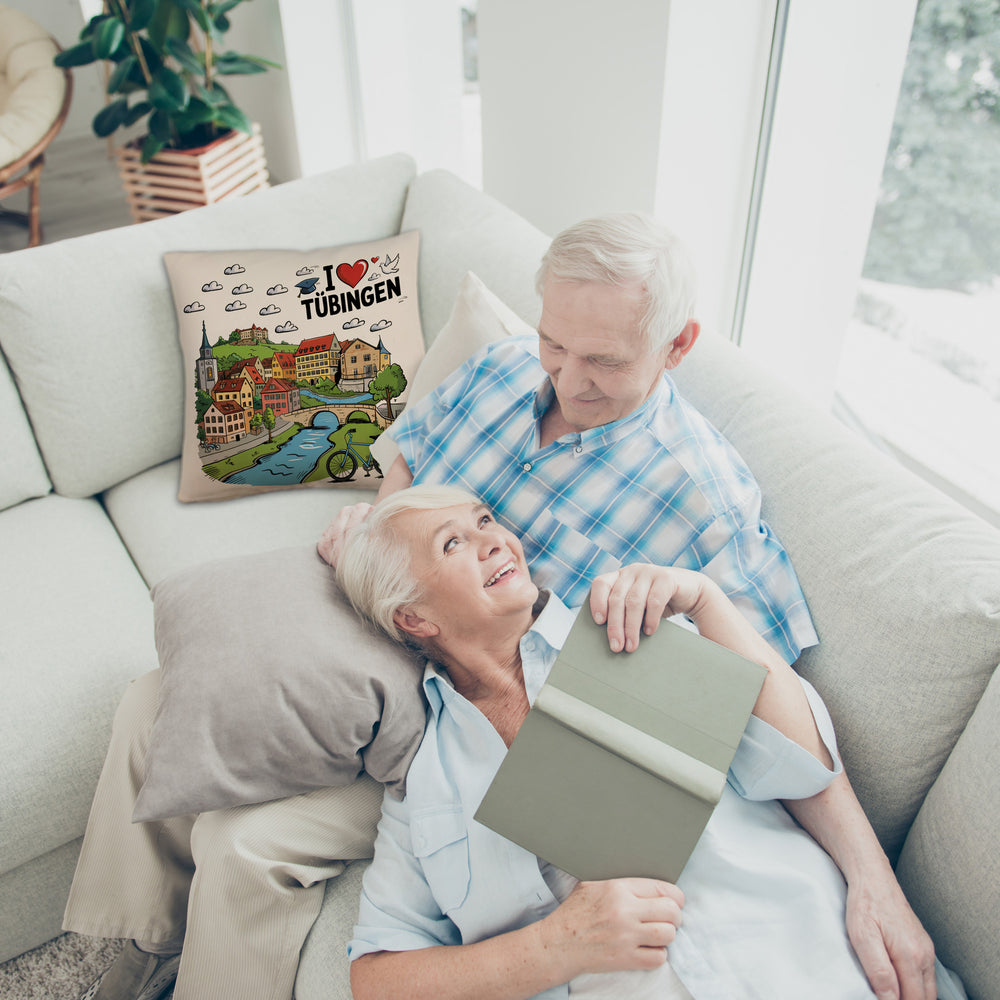 Willkommen auf der Couch der guten Laune! Das I Love Tübingen -Kissen ist nicht nur ein kuscheliges Wohnaccessoire, sondern auch eine humorvolle Hommage an eine der charmantesten Städte Deutschlands. Zeigen Sie Ihre Verbundenheit zur Universitätsstadt mit Charakter und Charme! Mit seinem liebevoll gestalteten Comic-Design und Illustrationen von Sehenswürdigkeiten wie dem Hölderlinturm, der Stiftskirche und dem Schloss Hohentübingen, zieht dieses Kissen alle Blicke auf sich. Die kleine, weiße Taube als Friedensbotschafter vollendet das Bild perfekt.Verfügbar in verschiedenen Stilen – ob als flauschiges Kuschelkissen, in edler Leinenoptik oder mit glänzender Satinoberfläche – passt es sich jedem Interieur, Geschmack und Bedürfnis an. Jedes Kissen wird mit Sorgfalt in unserer Kissen-Manufaktur in Deutschland gefertigt, denn Qualität steht bei uns an erster Stelle. Eine großartige Geschenkidee, besonders für Reisende mit Heimweh oder Tübingen-Fans, die ihre Liebe zur Stadt auf originelle Weise bekunden möchten. Drücken Sie Ihre Liebe zu dieser besonderen Stadt aus, kuscheln Sie sich ein und zaubern Sie ein Lächeln auf jedes Gesicht – mit dem unwiderstehlich charmanten I Love Tübingen -Kissen! Zeit, sich Ihre persönliche Liebeserklärung an Tübingen zu sichern!