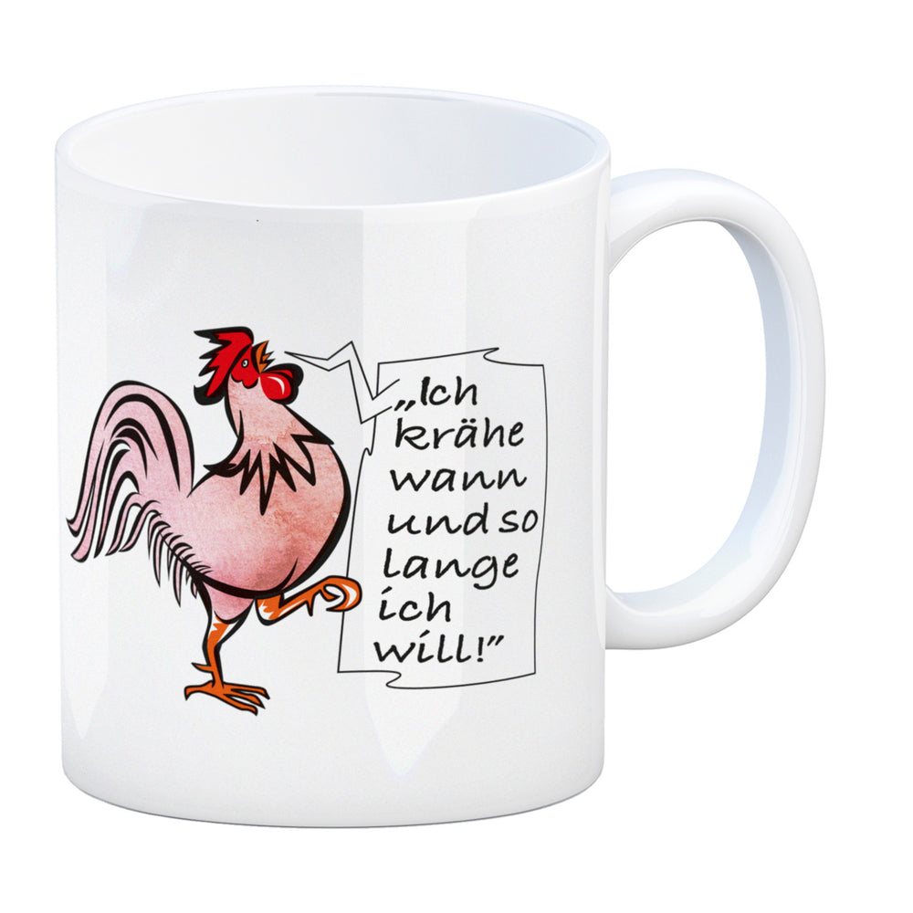 Kaffeebecher mit Hahn Motiv und Spruch: Ich krähe so lange ich will!