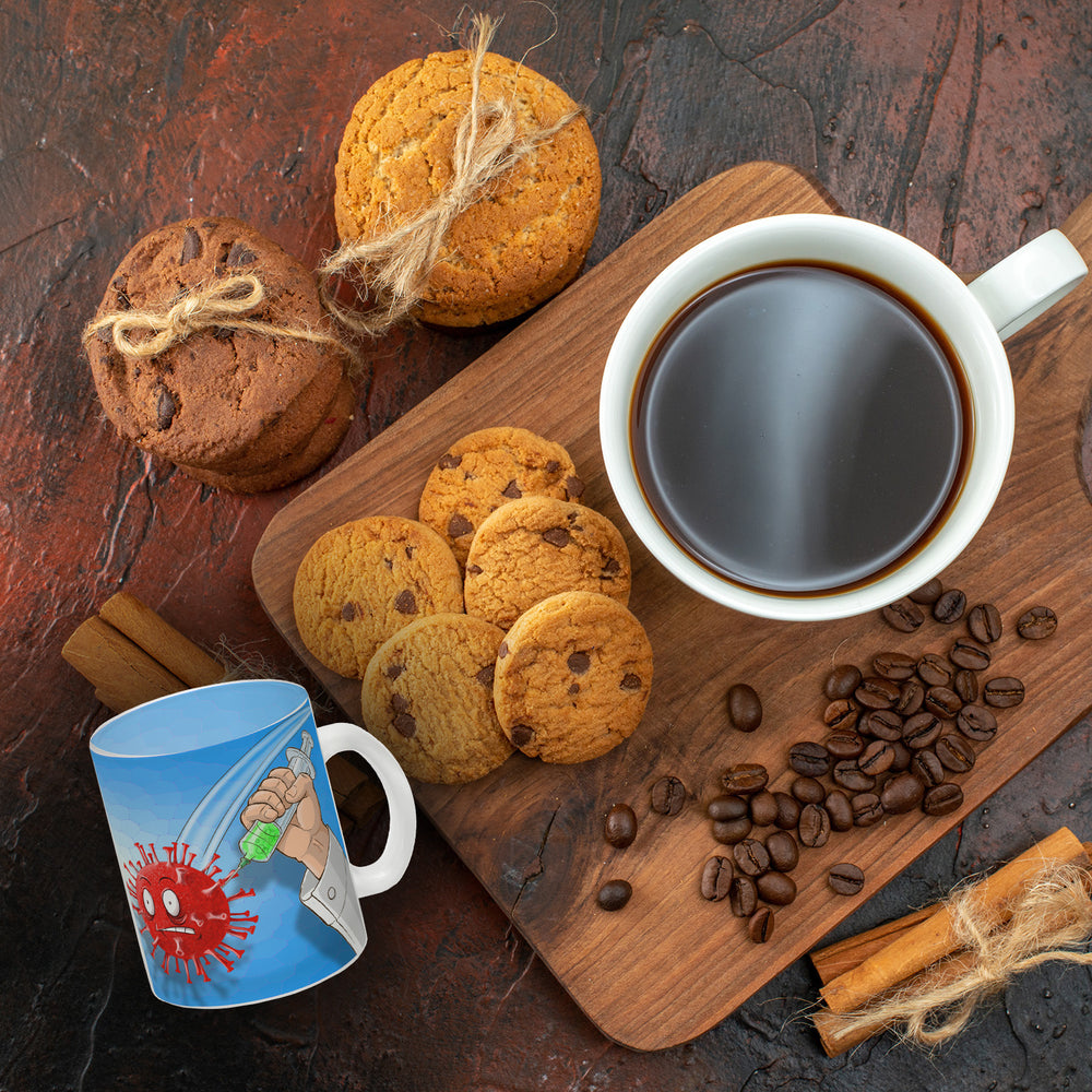 Kaffeebecher mit Virus und Spritzen Motiv - Geimpft! Lustiger Impfhumor