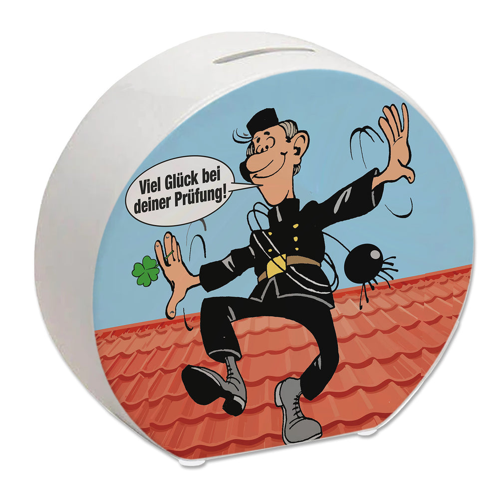 • Die Kaminfeger-Spardose ist ein charmantes Schmuckstück! Sie zeigt einen niedlichen Kaminfeger auf einem Dach, der ein vierblättriges Kleeblatt hält. Mit dem humorvollen Spruch "Viel Glück bei deiner Prüfung" peppt sie jeden Raum auf und zaubert dem Betrachter ein Lächeln ins Gesicht.