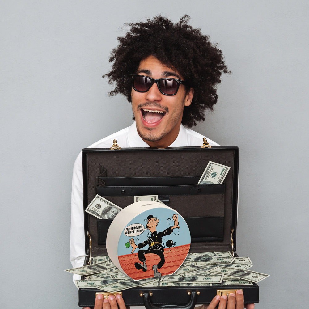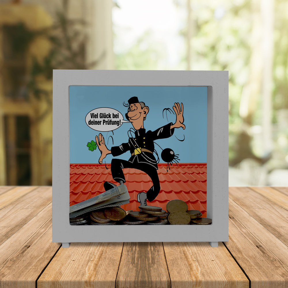 Kaminfeger Spardose mit Spruch: Viel Glück bei deiner Prüfung