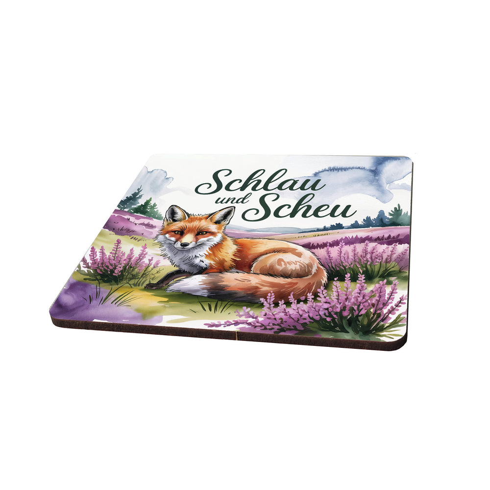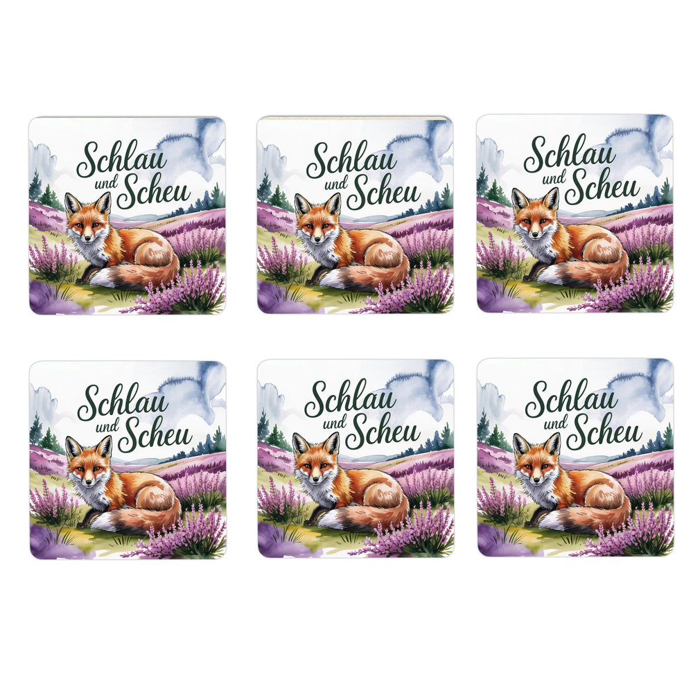 - Dieses bezaubernde Set von sechs Untersetzern zeigt eine Aquarellillustration eines Rotfuchses in der blühenden Lüneburger Heide. Der Fuchs, mit rotbraunem Fell und wachsamen Augen, schmiegt sich an die lavendelfarbenen Heideblüten. Der Spruch "Schlau und scheu" in Waldgrün fügt sich elegant in die verträumte Szenerie ein.