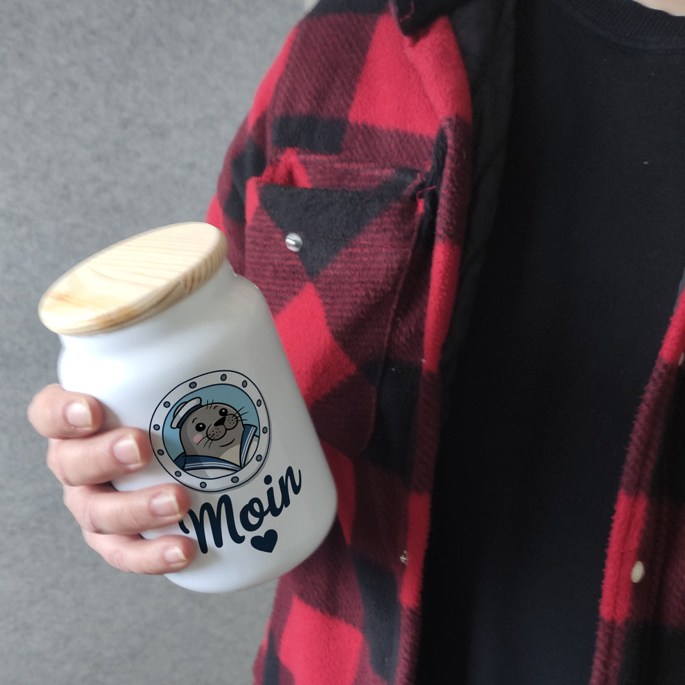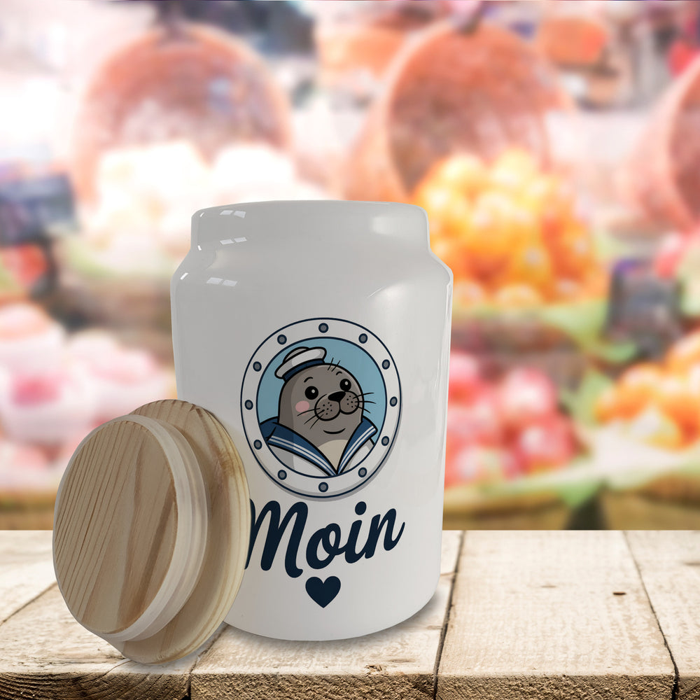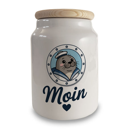 - Diese lustige Keksdose zeigt eine niedliche Cartoon-Robbe im Matrosenoutfit, mit freundlichem Gesicht und einem entzückenden Matrosenhut. Umrahmt von einem Bullauge, ist die Robbe auf einem hellblauen Hintergrund platziert, begleitet vom maritimen "Moin" und einem marineblauen Herz. Eine perfekte Ergänzung für alle nautisch inspirierten Küchen!