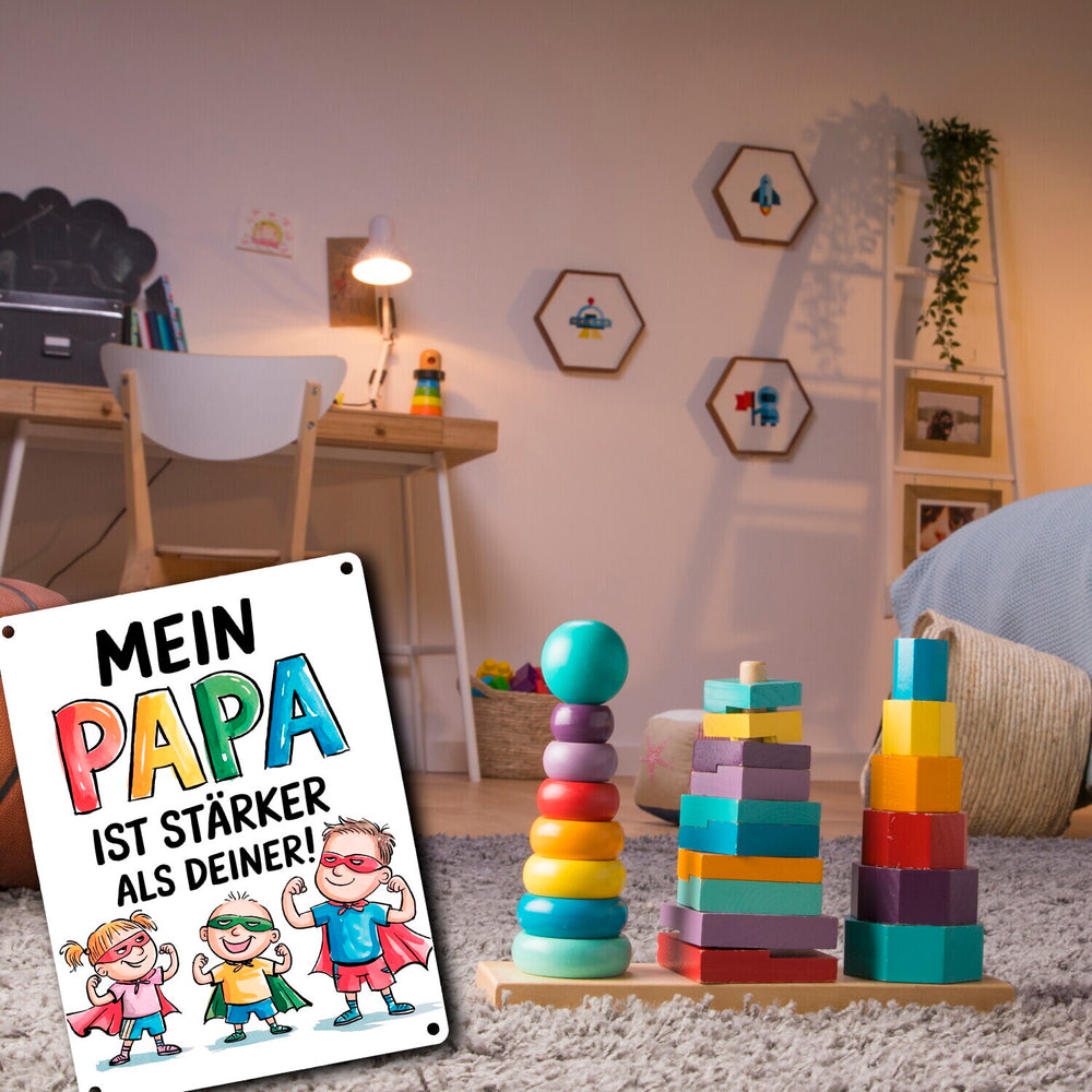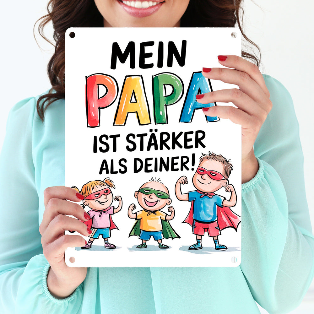 - Dieses Metallschild ist ein farbenfrohes Meisterwerk! Mit bunten Buchstaben verkündet es stolz: "MEIN PAPA IST STÄRKER ALS DEINER!" Auch sind drei superheldenverkleidete Kids zu sehen. Ein Mädchen im pinken Outfit, ein Junge mit grünem Umhang und ein blauer Junge mit rotem Cape. Perfekt für jeden Super-Vater!