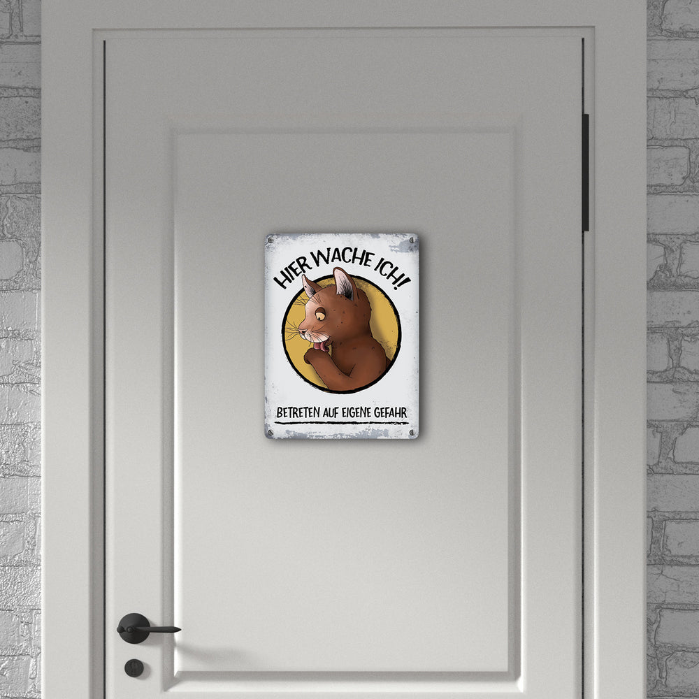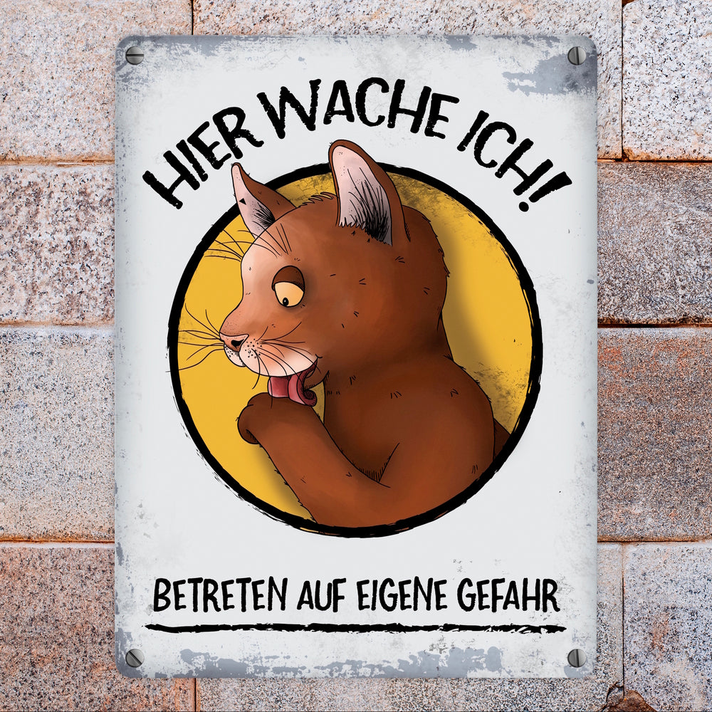Metallschild mit Katze Motiv und Spruch: Hier wache ich!