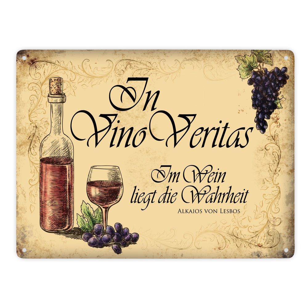 Nostalgisches Metallschild mit Weinmotiv und Zitat von Alkaios von Lesbos: "In Vino Veritas" (Im Wein liegt die Wahrheit bzw. Betrunkene sprechen die Wahrheit). Hinweise: Material: Aluminium / Dicke: 0,5 mm