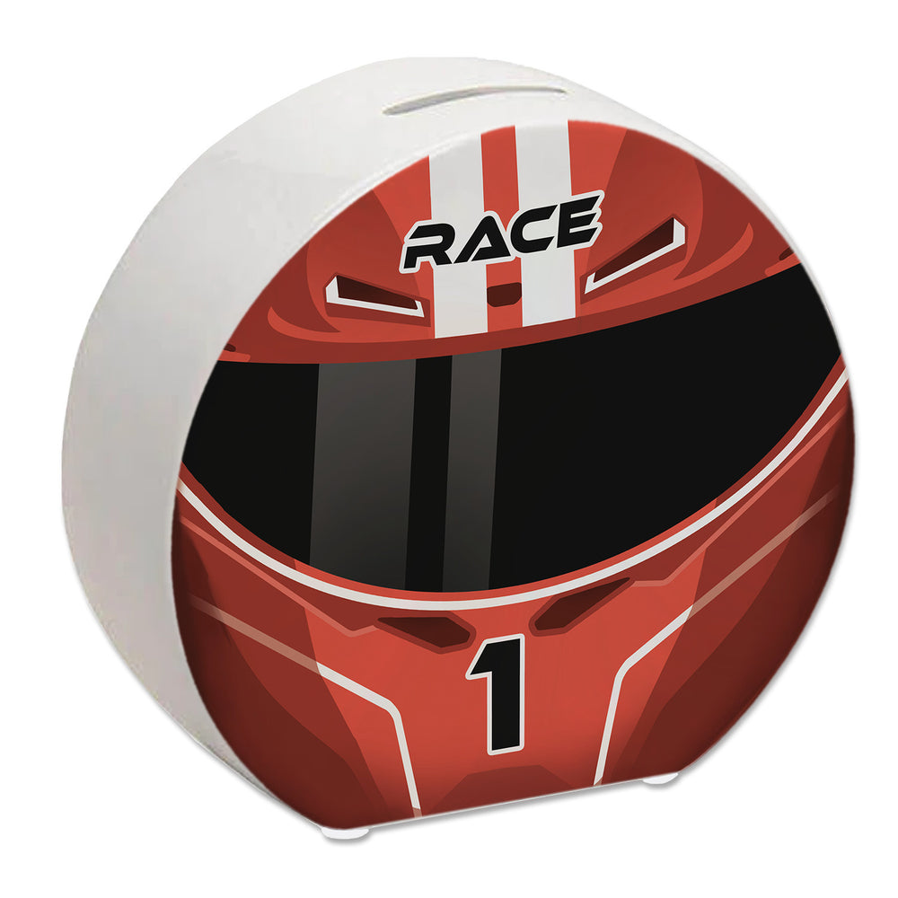 • Unsere coole Spardose ist ein echter Hingucker! In leuchtenden Farben und mit einem rasanten Motorsport-Helm Motiv versehen, ist sie ein Muss für jeden Auto- oder Motorradfan. Sie brauchen eine Spardose, um Ihr Kleingeld stilvoll zu sammeln und gleichzeitig Ihre Liebe zum Motorsport zu zeigen.