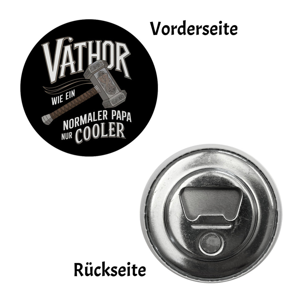 • Unser nordischer Hammer VATHOR Magnet beeindruckt auf einem tiefschwarzen Hintergrund mit kunstvoll verziertem Hammer, inspiriert von der Wikinger-Mythologie. Die weiße Aufschrift 'VATHOR' und der coole Spruch 'Wie ein normaler Papa nur viel cooler' machen diesen Magneten zum ultimativen Hingucker für jeden Kühlschrank.