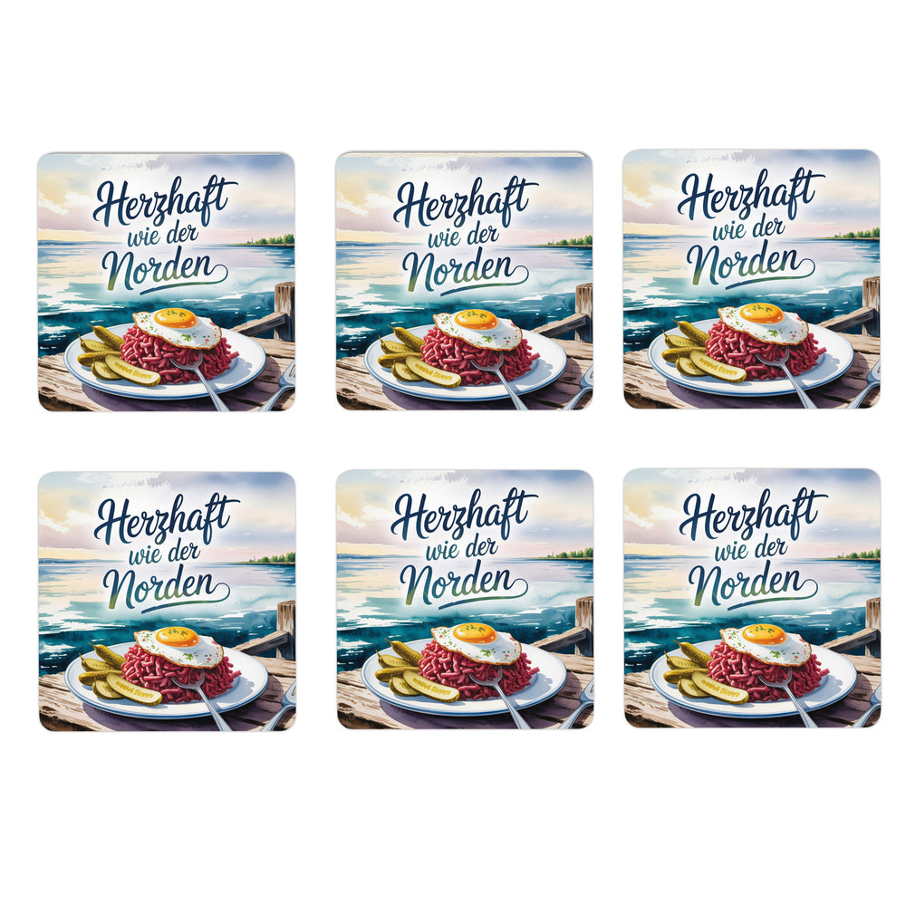 - Die Labskaus Untersetzer im 6er Set präsentieren ein Aquarellgemälde eines traditionellen Labskaus-Gerichts. Ein Corned Beef Hash, gekrönt von einem goldgelben Ei und begleitet von würzigen Gurken, alles serviert auf einem Holztisch mit Ostseeblick. Der Spruch "Herzhaft wie der Norden" rundet das maritime Design ab.