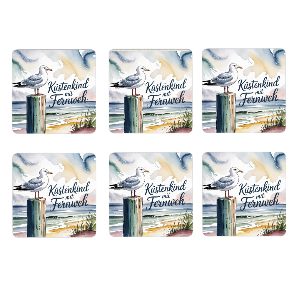 - Diese Untersetzer im 6er Set sind wahre Kunstwerke! Mit einer malerischen Aquarell-Möwe, die stolz auf einem alten Holzpfosten thront, bringen sie das Küstenflair direkt auf Ihren Tisch. Die sanften Farben und die elegante Schrift "Küstenkind mit Fernweh" verleihen ein maritimes Lebensgefühl. Perfekt für alle, die das Meer lieben!