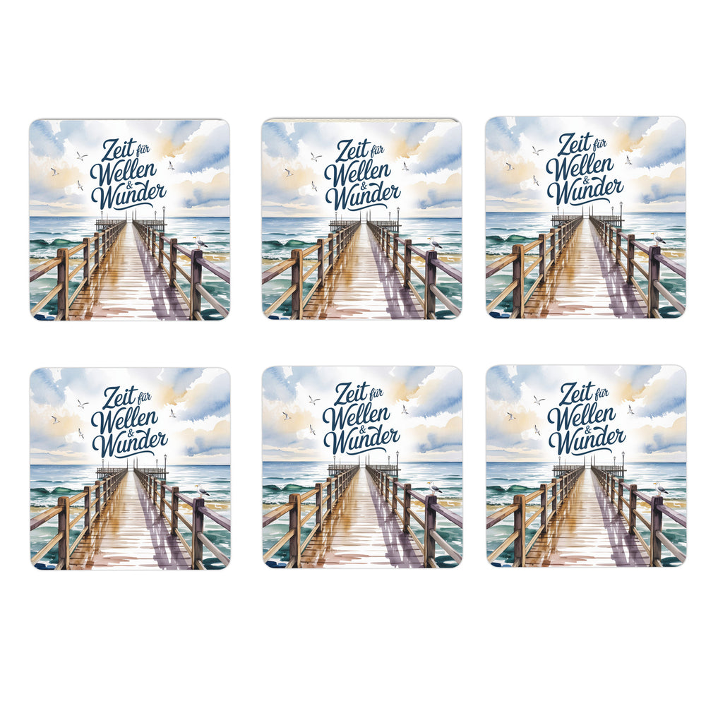 Ostsee Seebrücke 6er Set Untersetzer aus Holz - Zeit für Wellen & Wunder