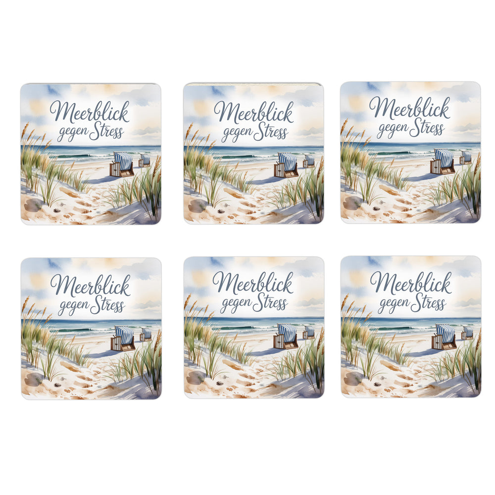 • Die Ostsee Strandkorb Untersetzer im 6er Set präsentieren ein bezauberndes Aquarellmotiv einer friedlichen Ostseestrandszene. Sanfte Dünen, wiegende Gräser und ein einladender blau-weiß gestreifter Strandkorb werden von weichem Licht umhüllt. Der Spruch "Meerblick gegen Stress" ergänzt das maritime Flair und strahlt pure Entspannung aus.