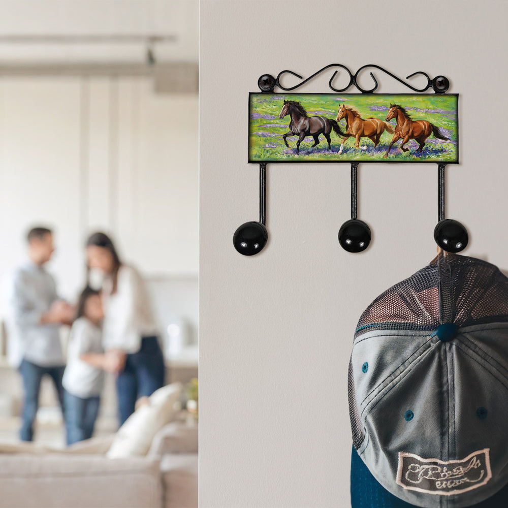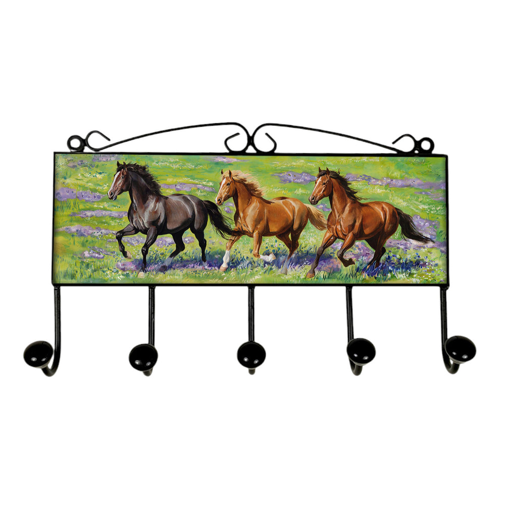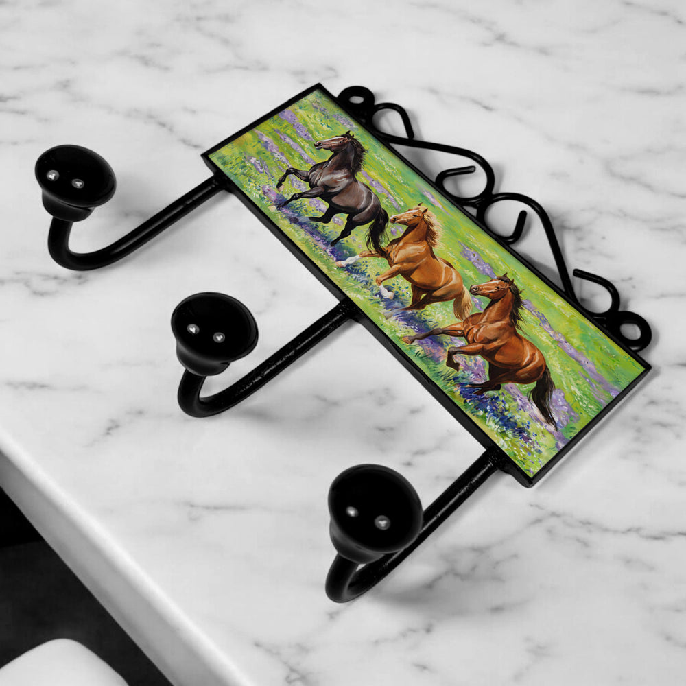 - Diese Kleiderhakenleiste ist ein wahres Kunstwerk! Ein Aquarellgemälde zeigt drei majestätische Pferde, die über eine lebendige, blühende Wiese galoppieren. Mit prachtvollen lila Blumen und einem himmlischen Naturhintergrund bringt sie Freiheit und Eleganz in jeden Raum. So wird Ihr Flur zum stilvollen Hingucker!
