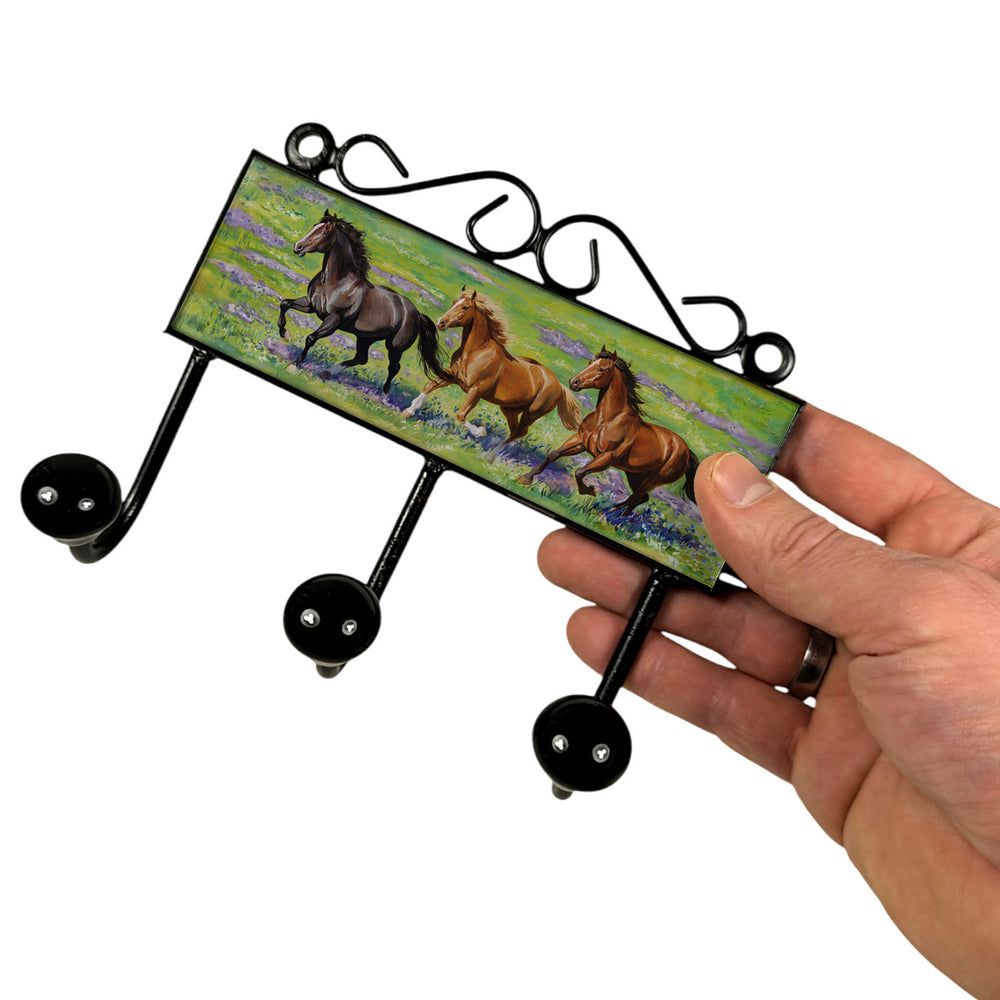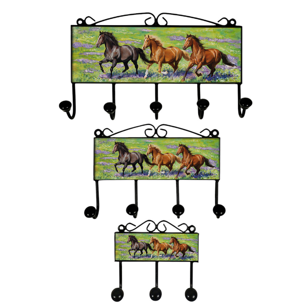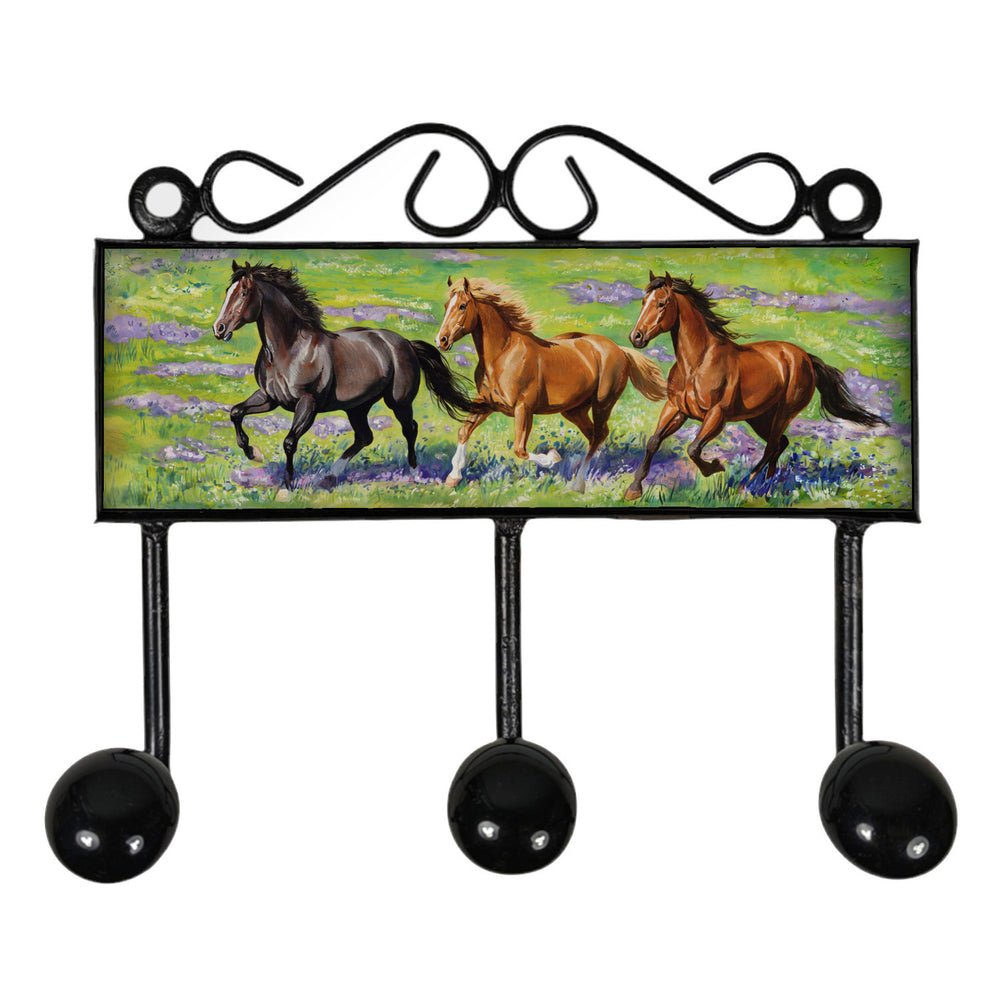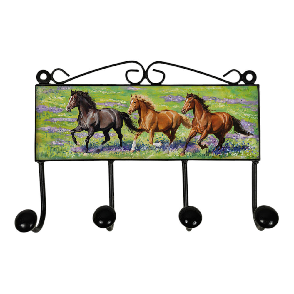 - Diese Kleiderhakenleiste ist ein wahres Kunstwerk! Ein Aquarellgemälde zeigt drei majestätische Pferde, die über eine lebendige, blühende Wiese galoppieren. Mit prachtvollen lila Blumen und einem himmlischen Naturhintergrund bringt sie Freiheit und Eleganz in jeden Raum. So wird Ihr Flur zum stilvollen Hingucker!