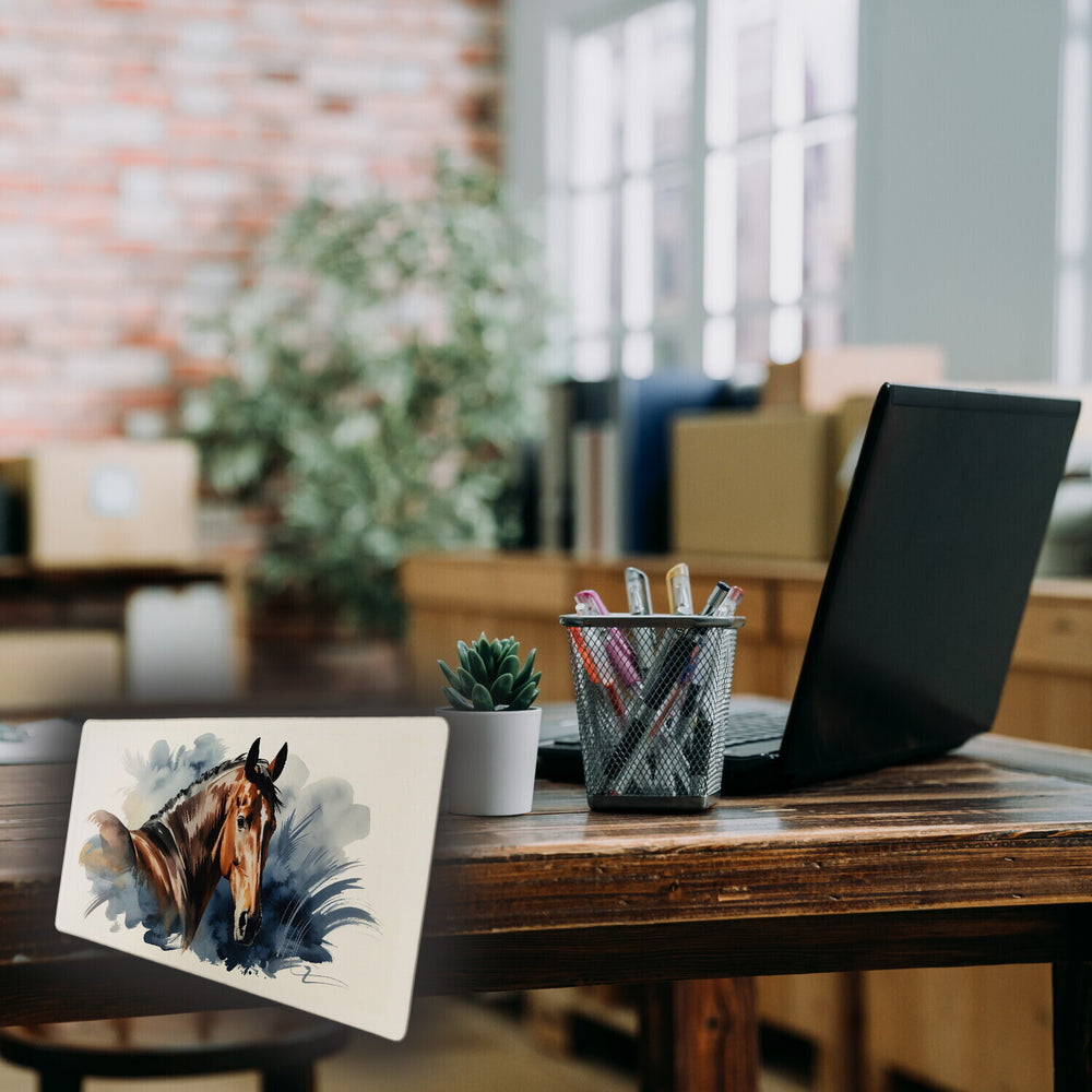• Die Schreibtischunterlage zeigt ein faszinierendes digitales Aquarellgemälde eines majestätischen braunen Pferdekopfes vor einem dramatischen blau-grauen Hintergrund. Der sanfte Ausdruck und der muskulöse Hals des Pferdes, kombiniert mit einer dynamischen Mähne, schaffen einen ätherischen Look. Die Komposition und Farbtöne verleihen jedem Büro eine elegante und künstlerische Note.