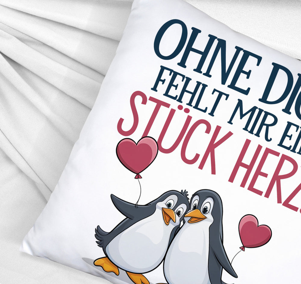 - Das "Pinguine Ohne dich fehlt ein Stück Herz Kissen" ist ein liebevolles Dekokissen mit zwei umarmenden Pinguinen im Cartoon-Stil. Auf weißem Hintergrund strahlen sie zusammen mit dem herzberührenden Spruch. Zwei rote Ballons in Herzform komplettieren die Szene, die einfach zum Verlieben ist.
