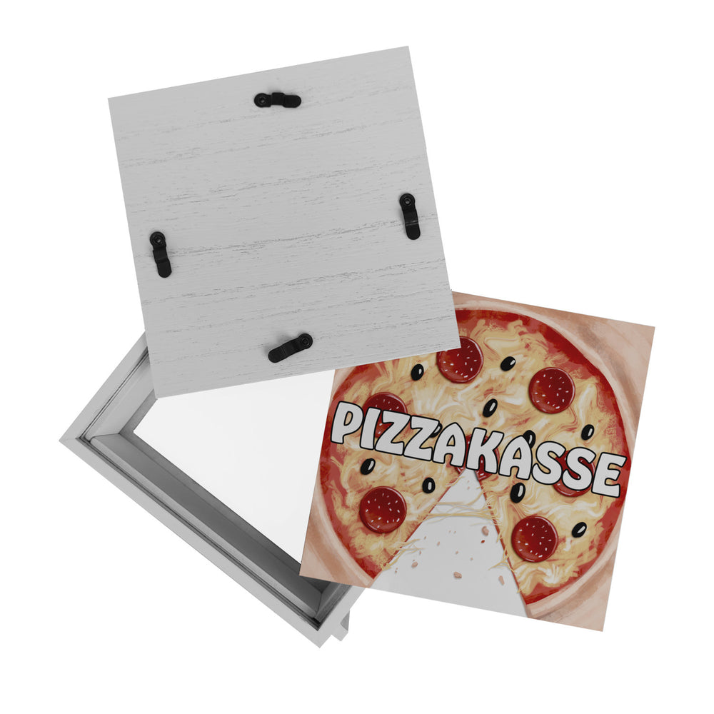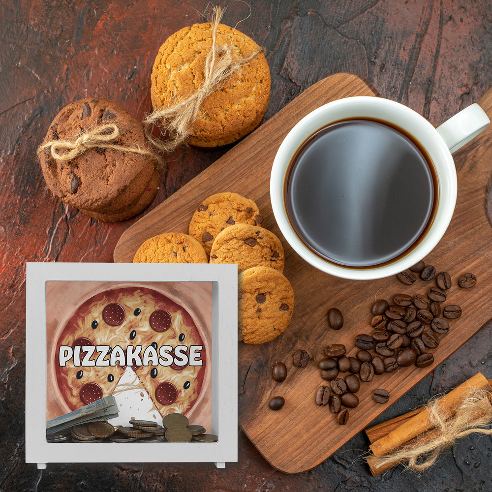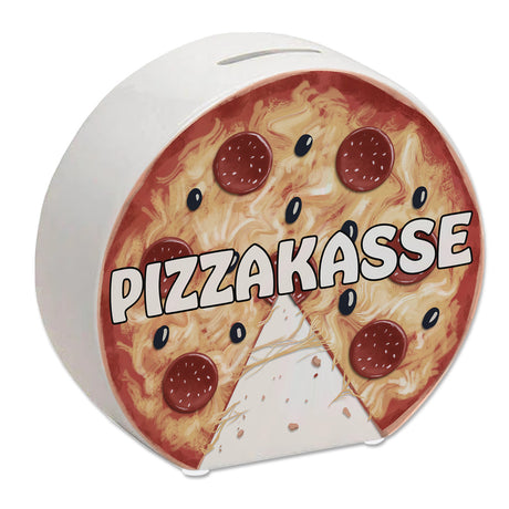 • Auf der runden Spardose mit flachem Boden ist eine große Pizza mit Salami und Oliven abgebildet, welcher schon ein Stück fehlt. In weißer Schrift steht darauf: Pizzakasse. Die Grundfarbe der Spardose ist weiß.