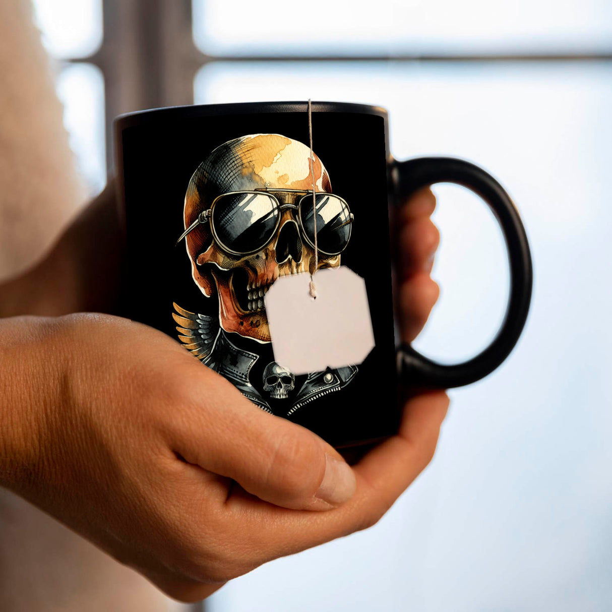 • Mit der Rocker Totenkopf Tasse schnappst du dir den Eyecatcher für dein Frühstücksbrett! Schwarz wie die Nacht, grinst das Skelett mit seiner dunklen Sonnenbrille jeden noch so müden Morgenmuffel an. Nicht nur ein Becher – sondern dein Statement für starken Kaffee und starken Stil!