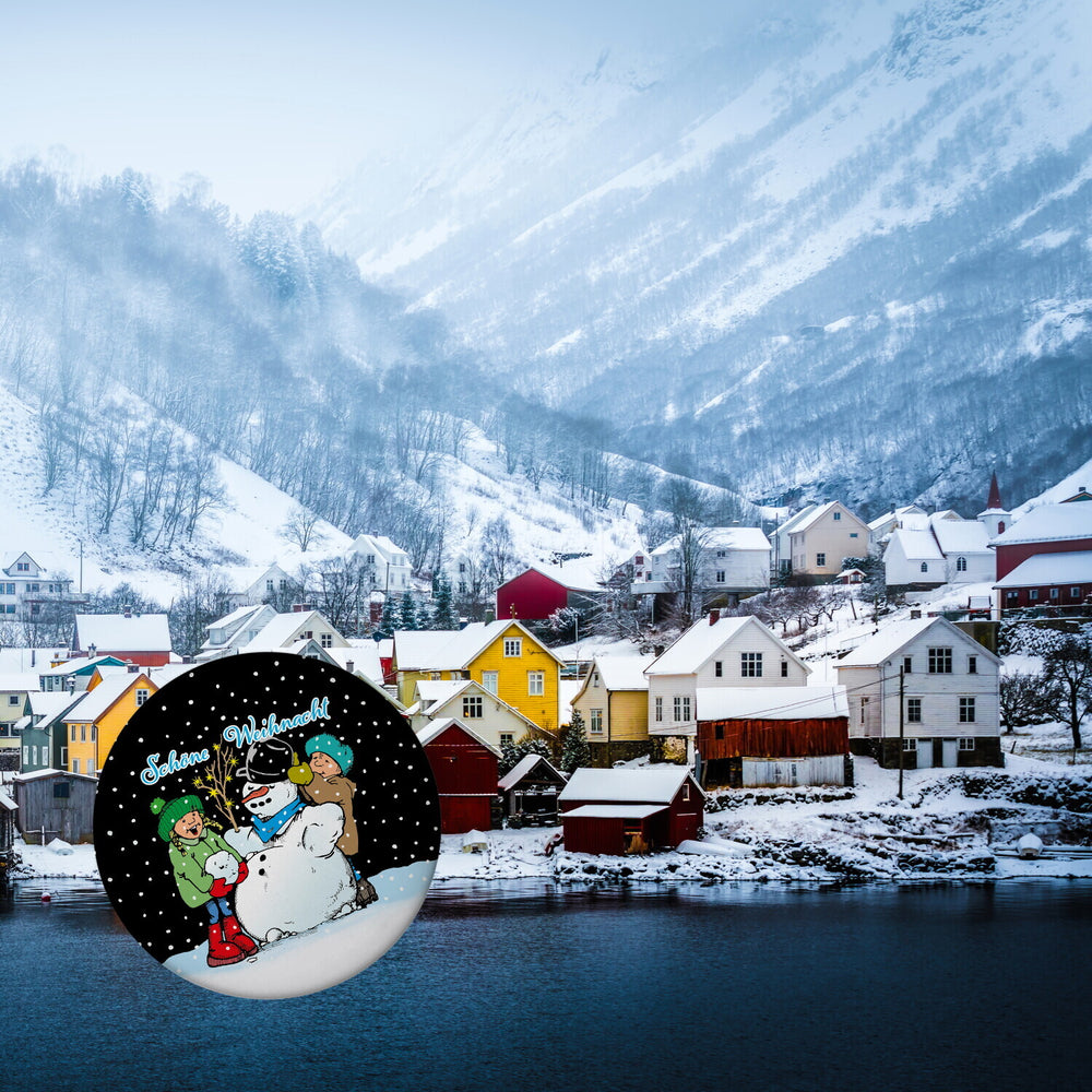 • Der runde Magnet zeigt ein bezauberndes Winterszenario: Zwei Kinder haben einen fröhlichen Schneemann gebaut, der einen Zweig mit funkelnden Sternen in seinem Arm hält. Der Spruch "Frohe Weihnacht" rundet das Motiv ab und bringt festliche Stimmung in jedes Heim. Ein charmanter Hingucker für die Weihnachtszeit!