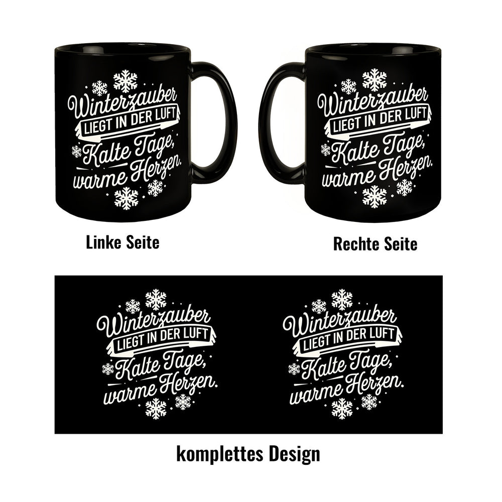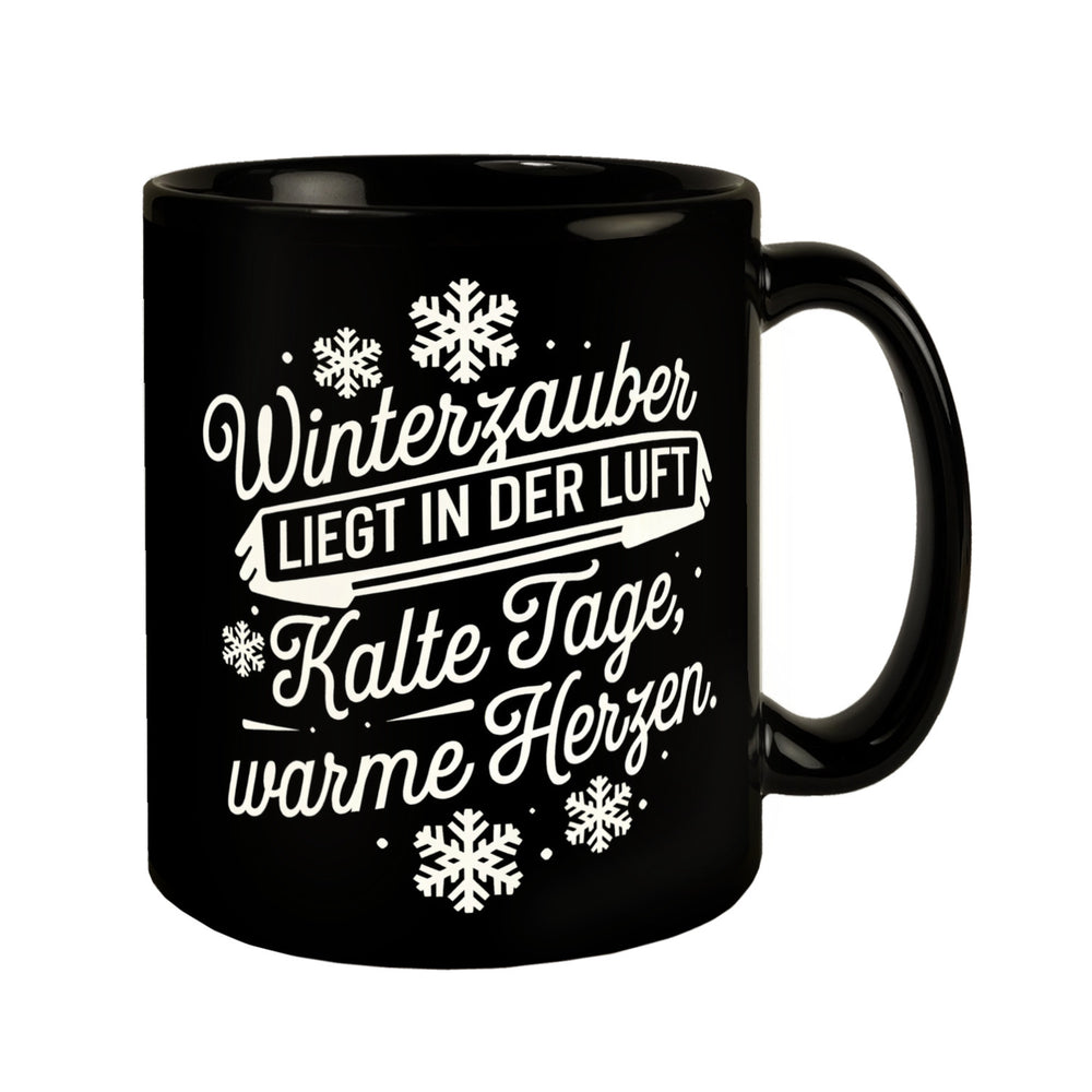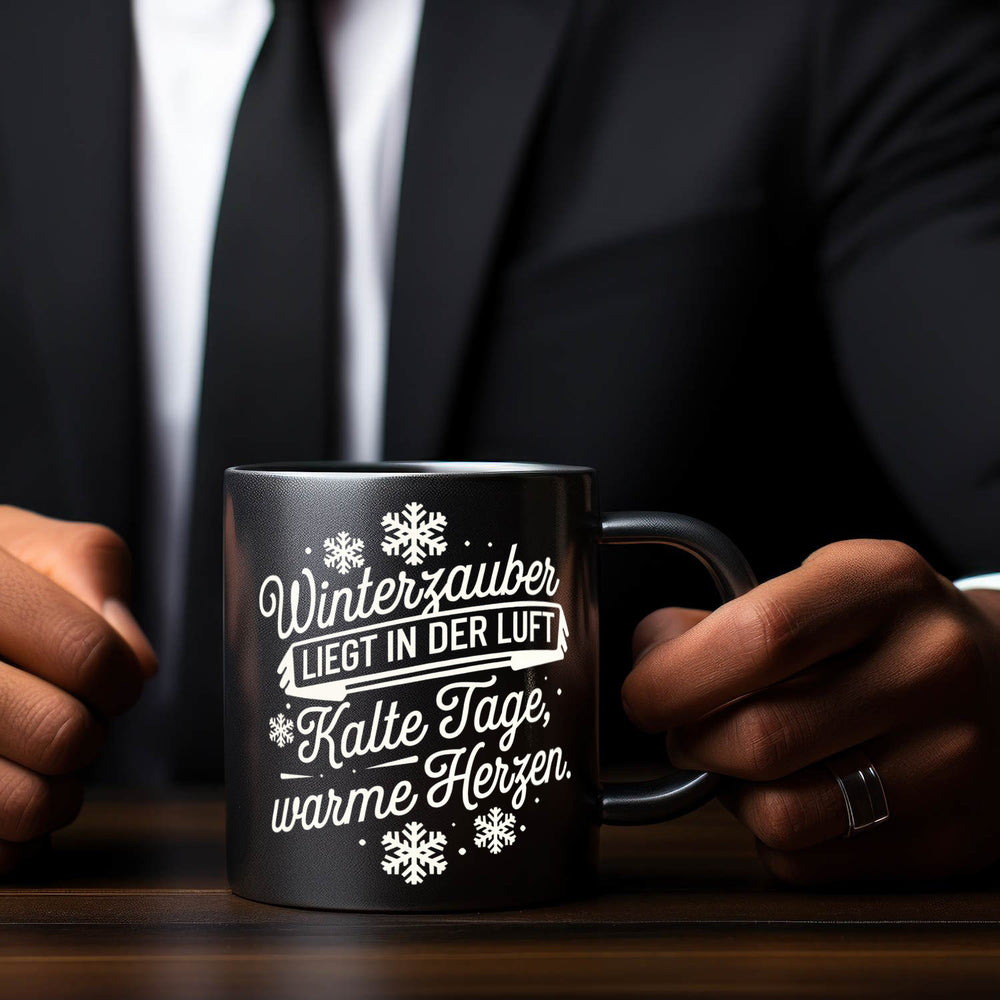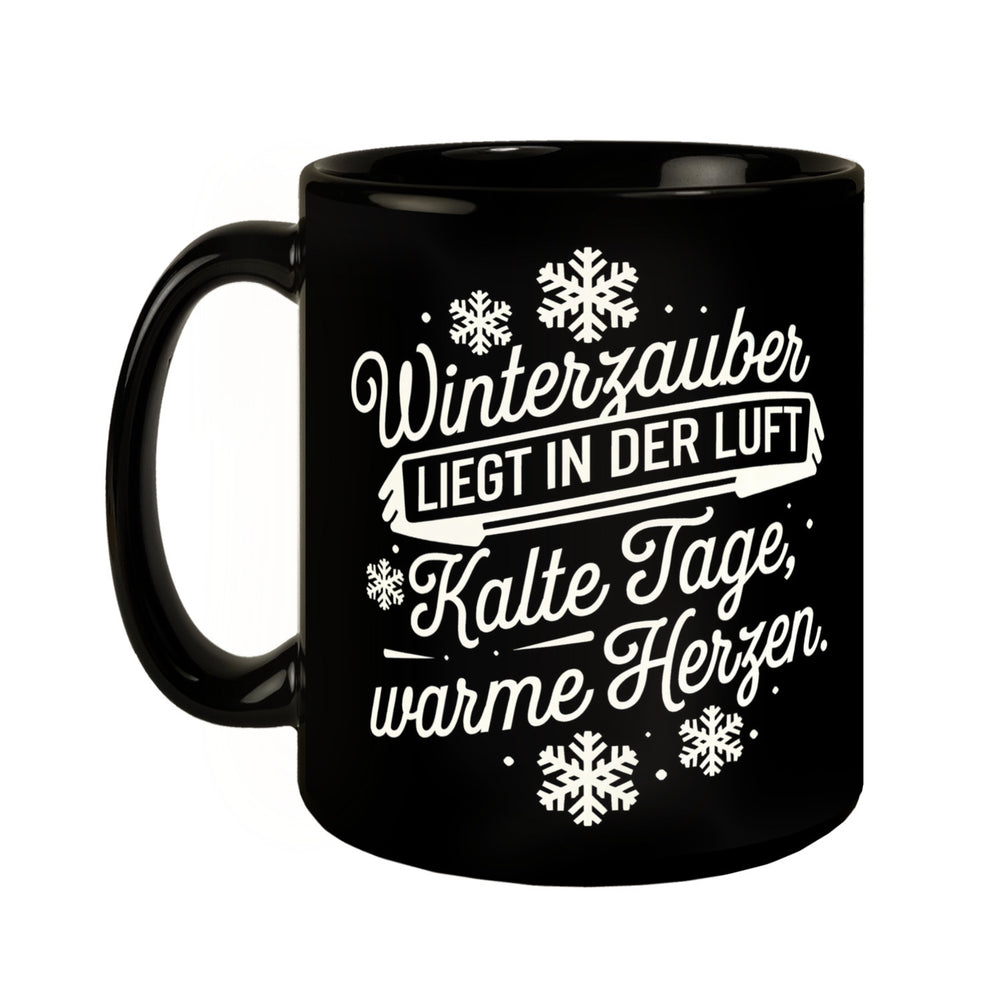 - Mit dem Kaffeebecher "Winterzauber" verwandeln sich kalte Tage in gemütliche Stunden! Der schwarze Becher mit dem eleganten Schriftzug "Winterzauber liegt in der Luft – kalte Tage, warme Herzen" und zarten Schneeflocken bringt die Magie des Winters direkt auf Ihren Frühstückstisch. Perfekt für Kaffeeliebhaber und Winterfans!