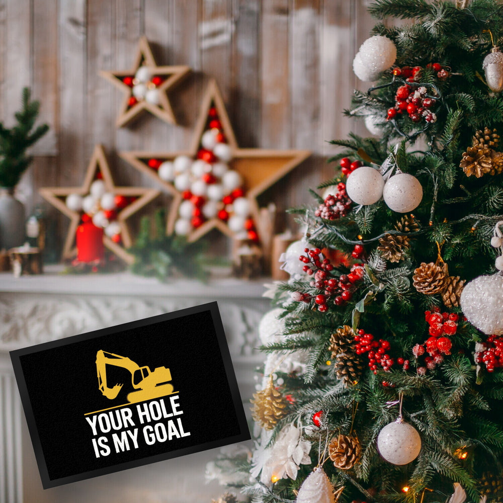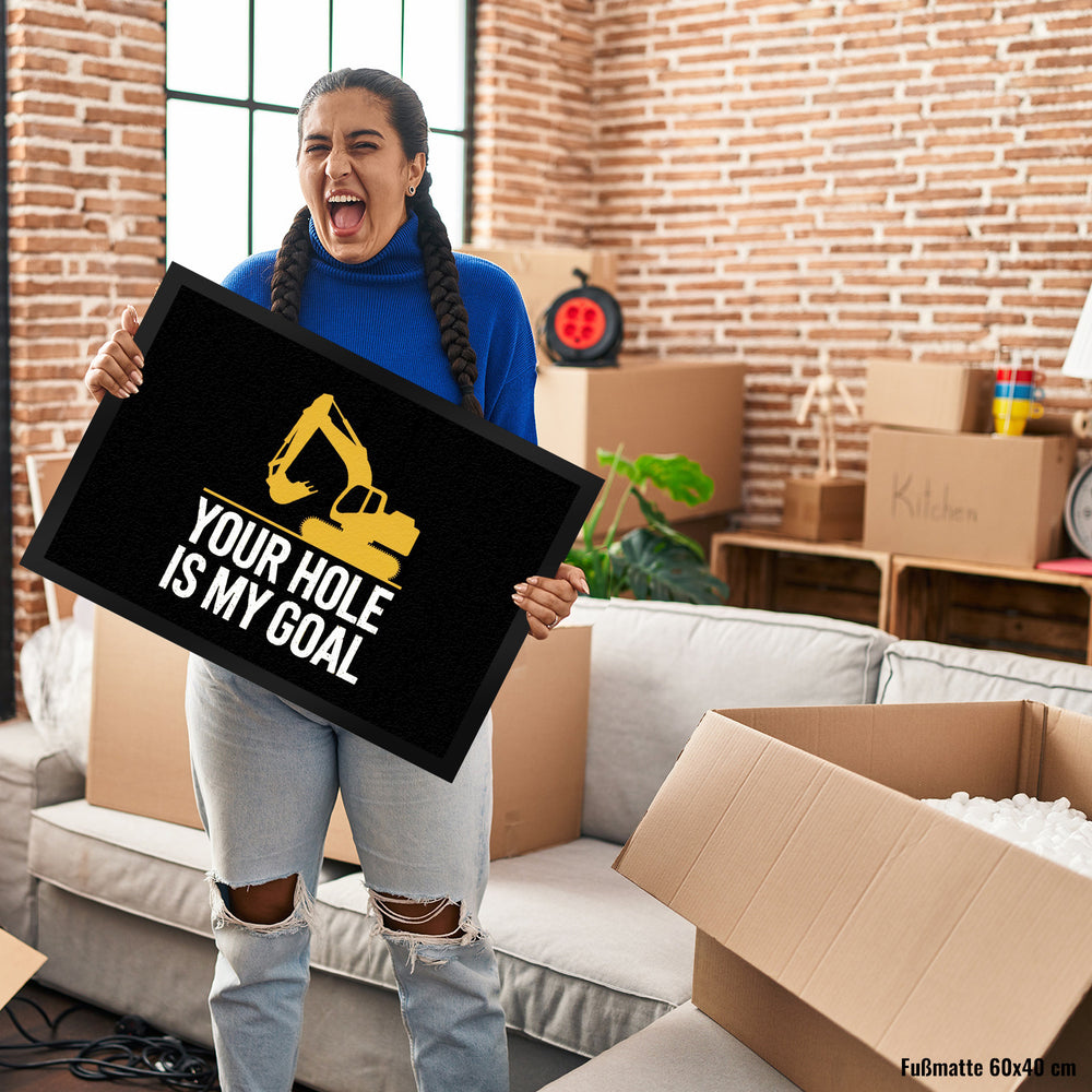 - Die "YOUR HOLE IS MY GOAL" Fußmatte bringt mit ihrem lustigen Bagger-Design und der gelben Silhouette auf schwarzem Hintergrund Humor in jeden Eingangsbereich. Der freche Spruch sorgt garantiert für Lacher und zieht Baggerfahrer sowie Schürzenjäger gleichermaßen in seinen Bann!