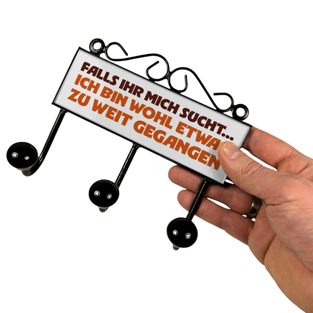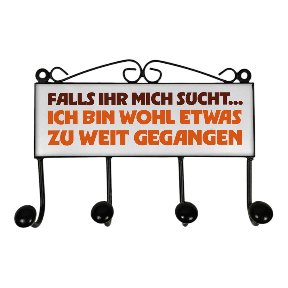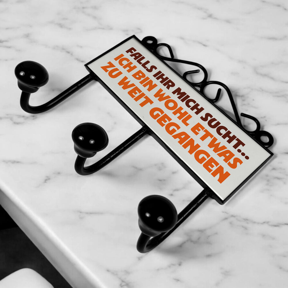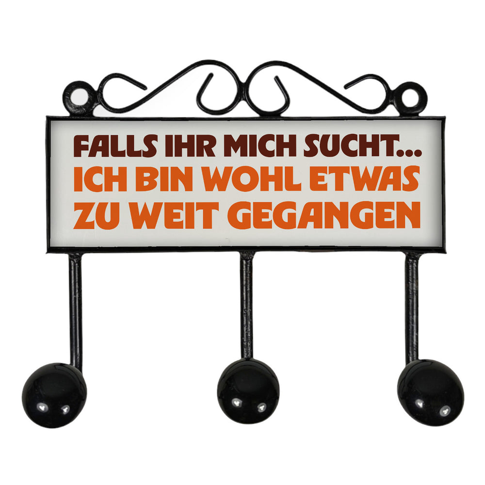 - Diese Garderobenleiste ist ein humorvolles Meisterwerk! Mit dem frechen Spruch "Zu weit gegangen, ich bin wohl ein wohl etwas falls ich mich sucht..." in zweifarbigem Textdesign zieht sie alle Blicke auf sich. Der schlichte weiße Hintergrund lässt den Text strahlen und begeistert mit lustig angeordneten Blockbuchstaben. Ein echtes Highlight für jede Wand!